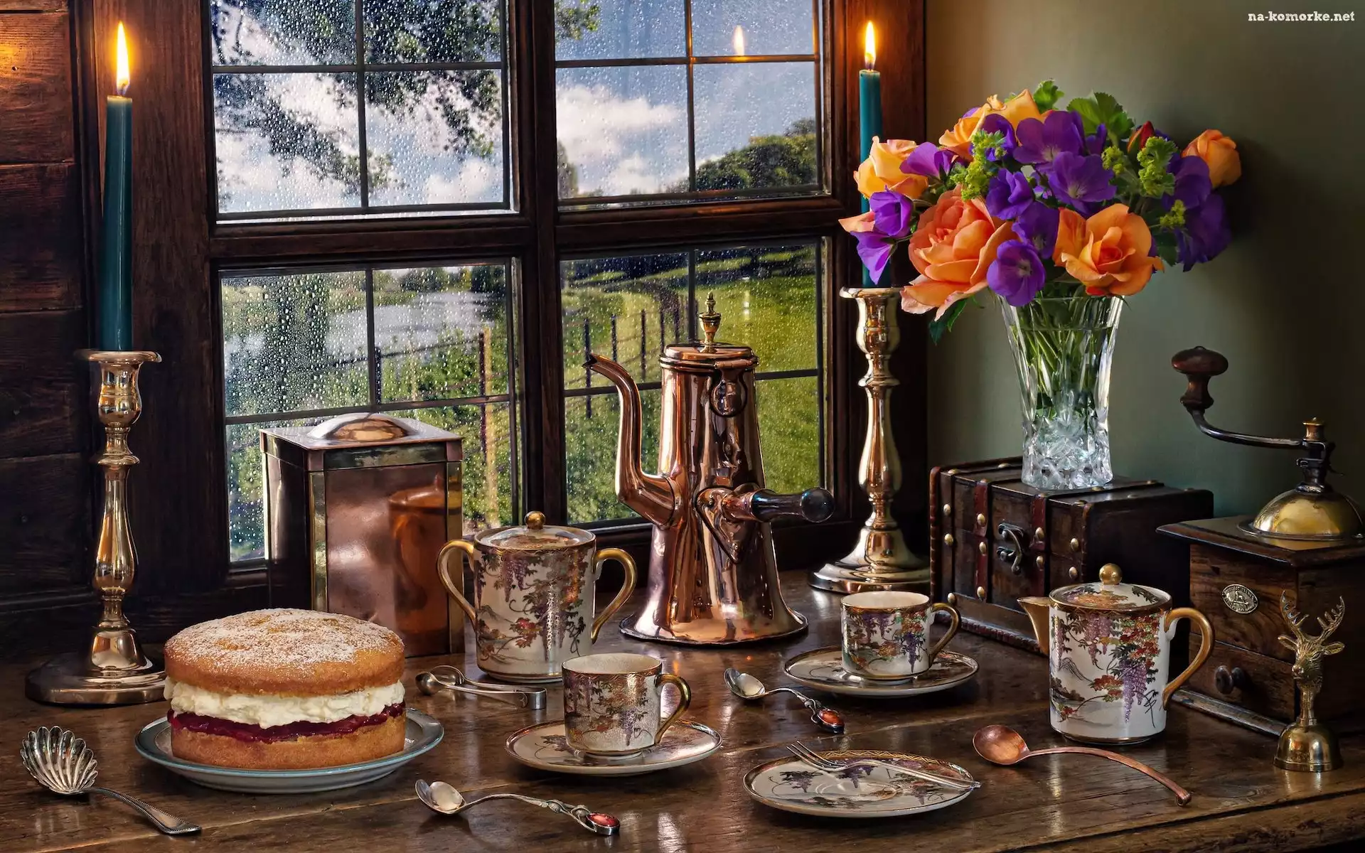Kompozycja, Młynek, Bukiet kwiatów, Serwis porcelanowy, Okno, Świece, Dzbanek, Ciasto na Komórkę |
