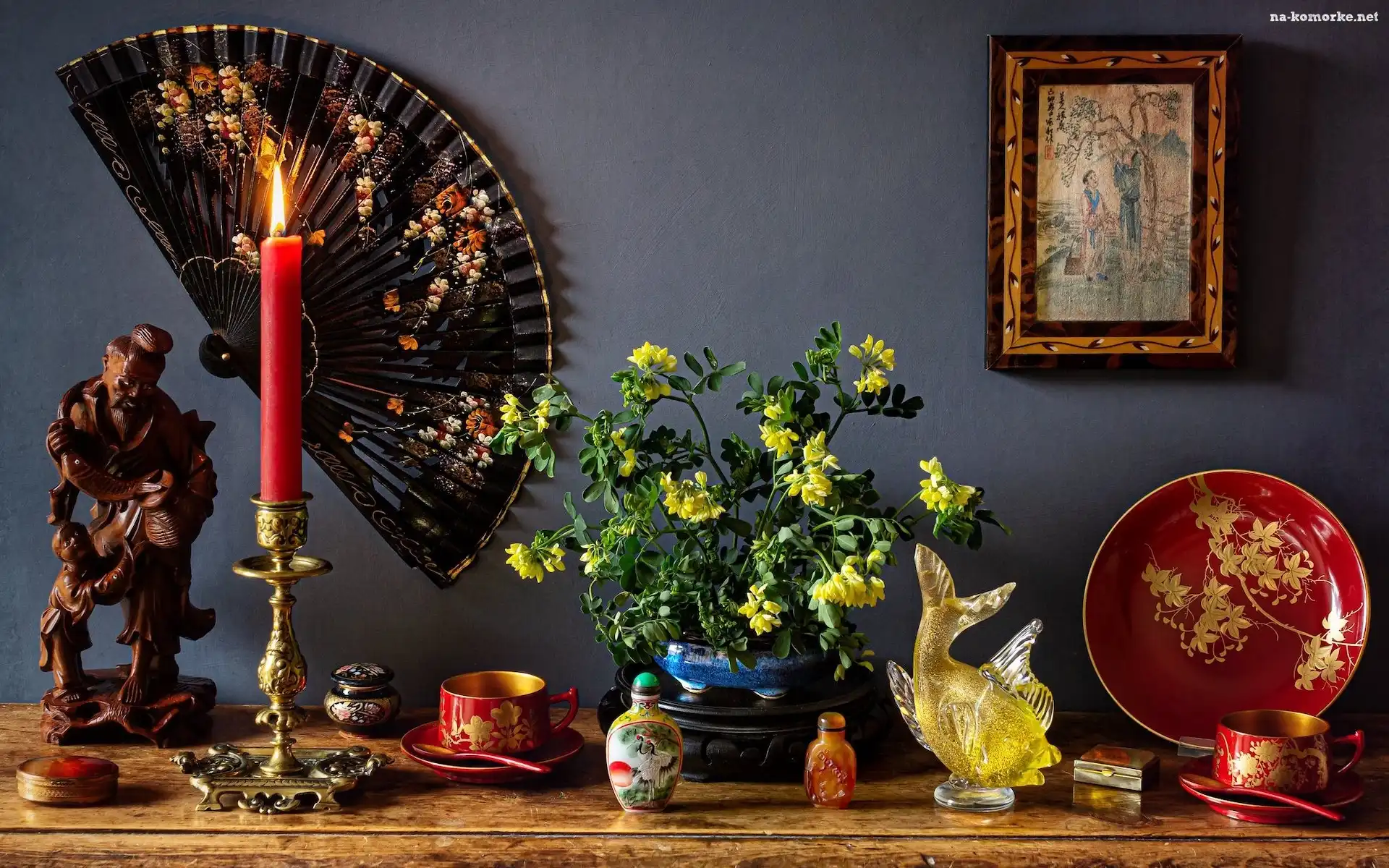Kompozycja, Cieciorki, Obrazek, Świeca, Wachlarz, Figurka, Kwiaty na Komórkę