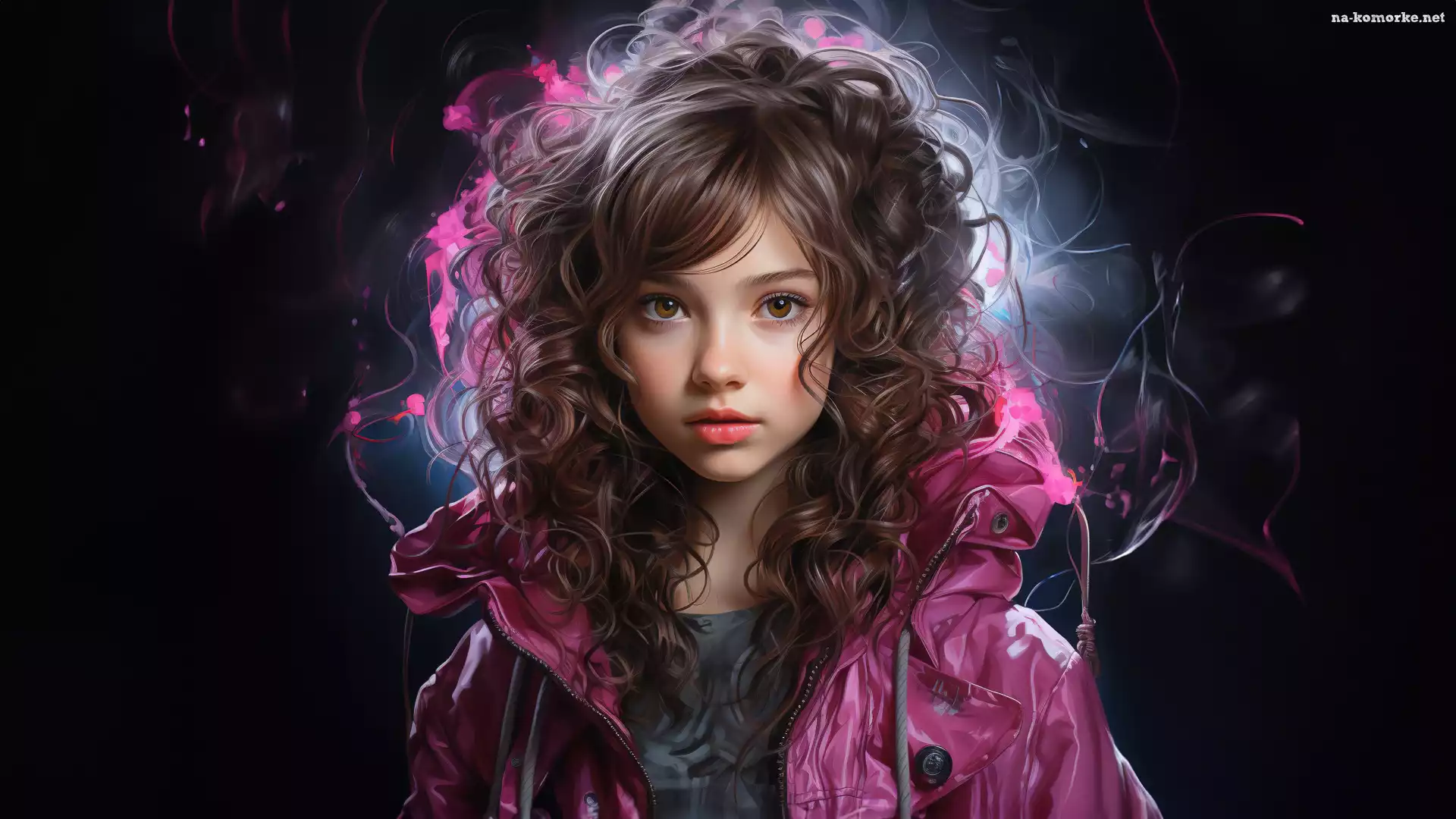 Ciemne, Fioletowa, Grafika, Włosy, Kręcone, Długie, Dziewczynka, Kurtka, Tło na Komórkę