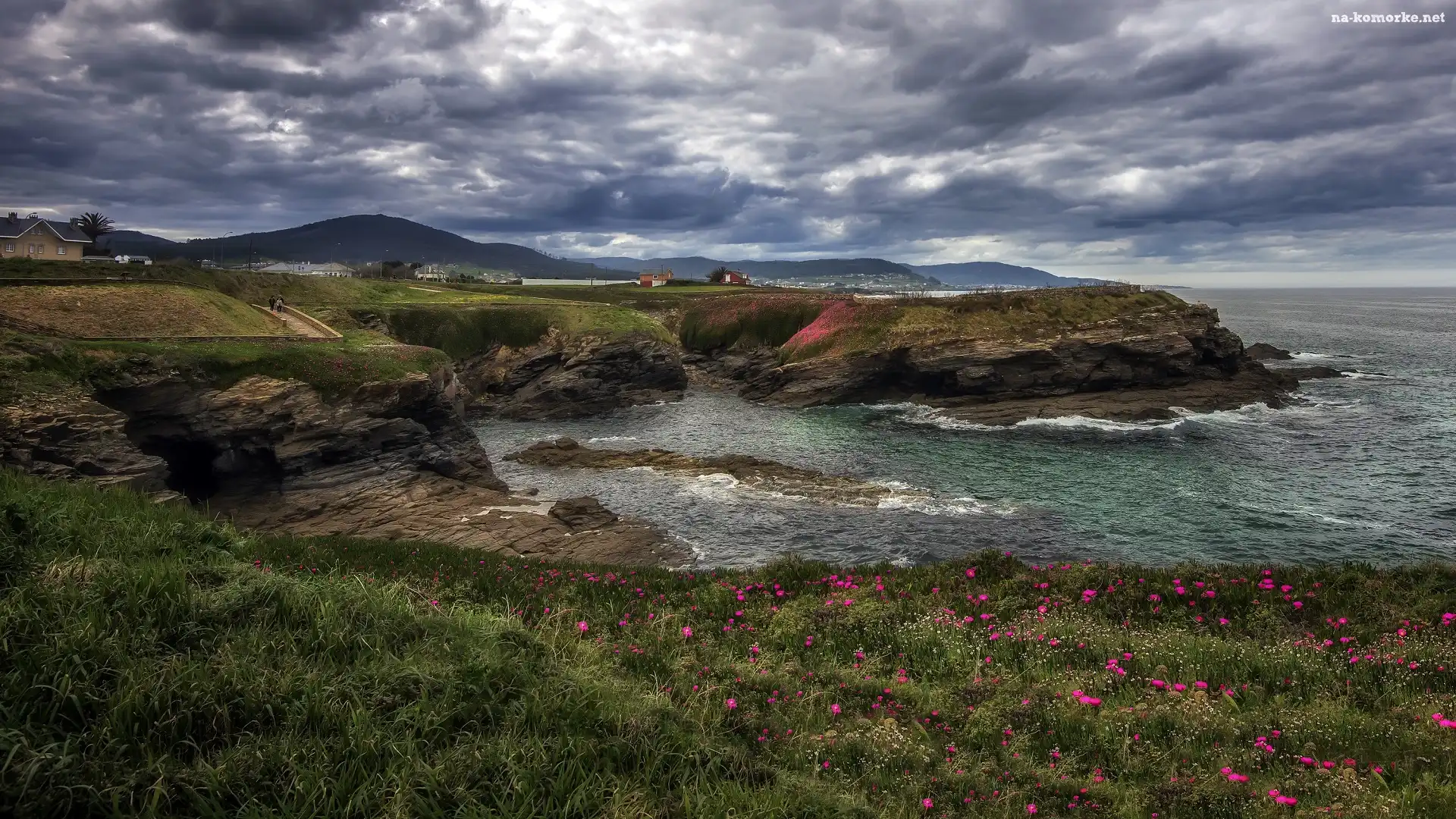 Wybrzeże, Ciemne, Chmury, Domy, Kwiaty, Skały, Morze na Komórkę