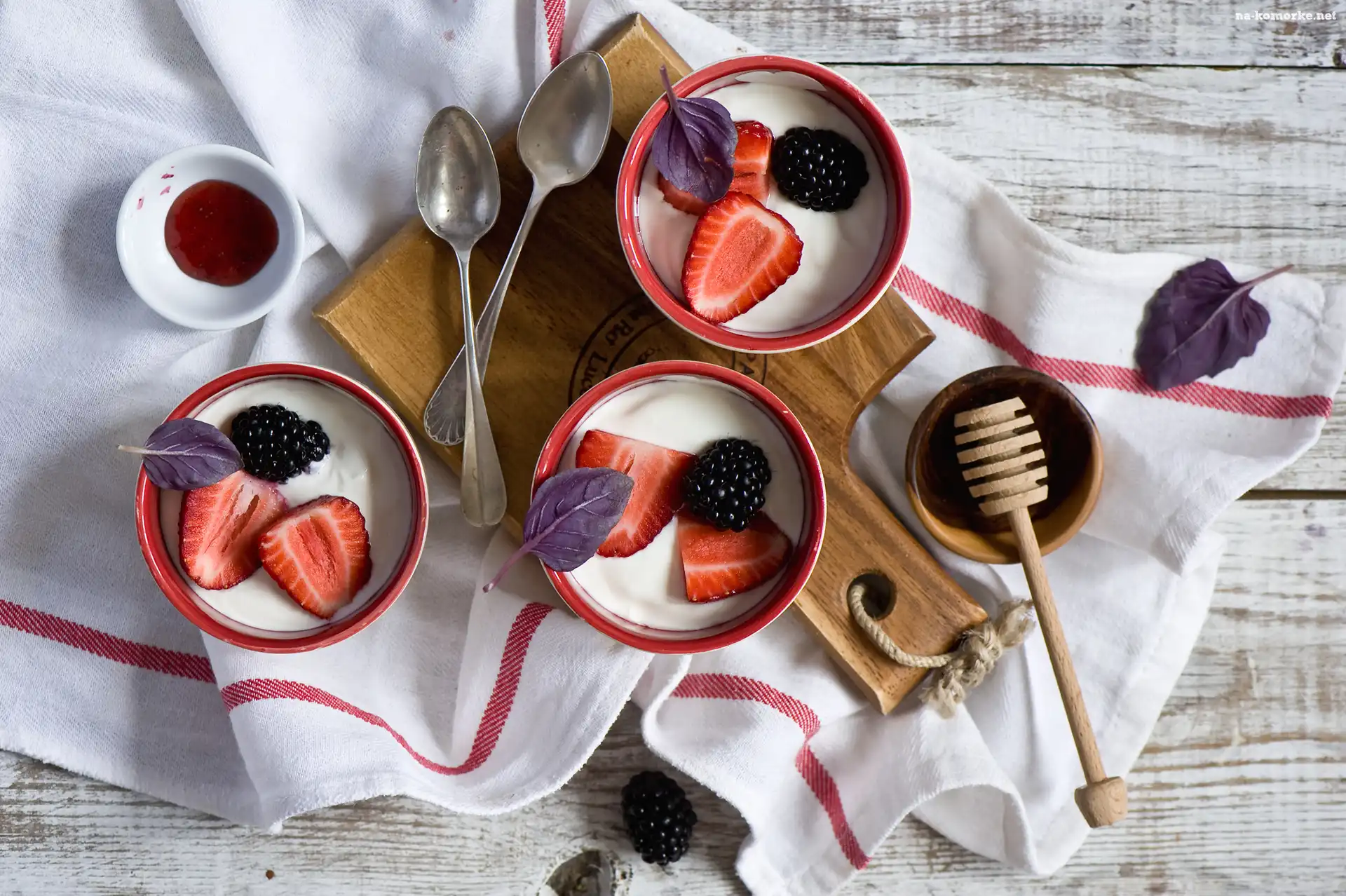 Deser, Ściereczka, Truskawki, Łyżeczki, Miseczki, Jeżyny, Miód, Deska na Komórkę