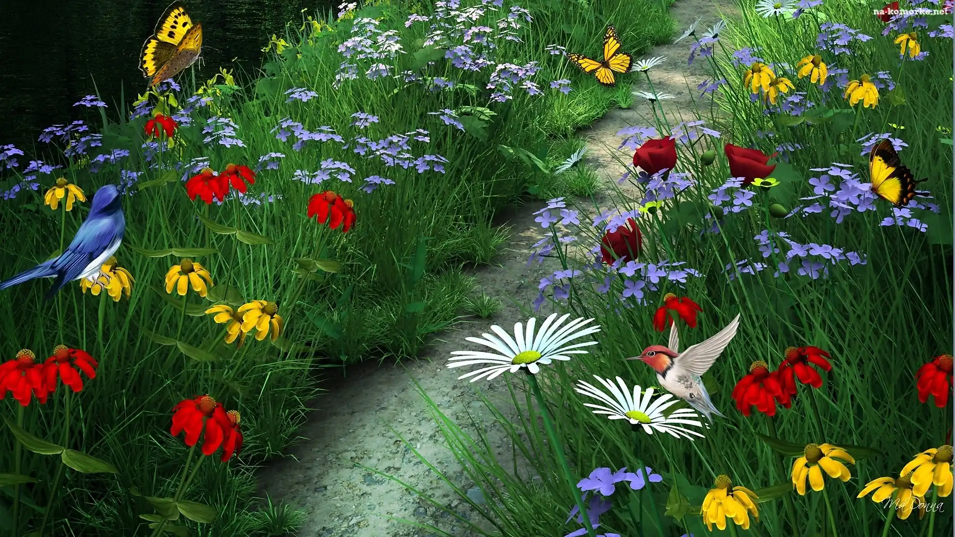 Ścieżka, Motyle, Rzeka, Kolorowe, Polne, Kwiaty, Ptaszki na Komórkę