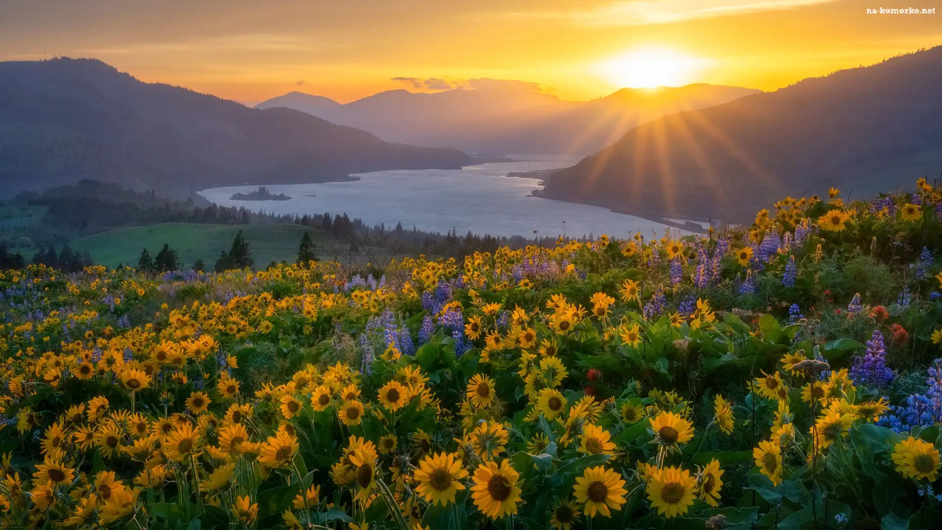 Kwiaty, Góry, Balsamorhiza, Columbia River Gorge, Rzeka, Waszyngton, Stany Zjednoczone, Promienie słońca, Łubin na Komórkę |