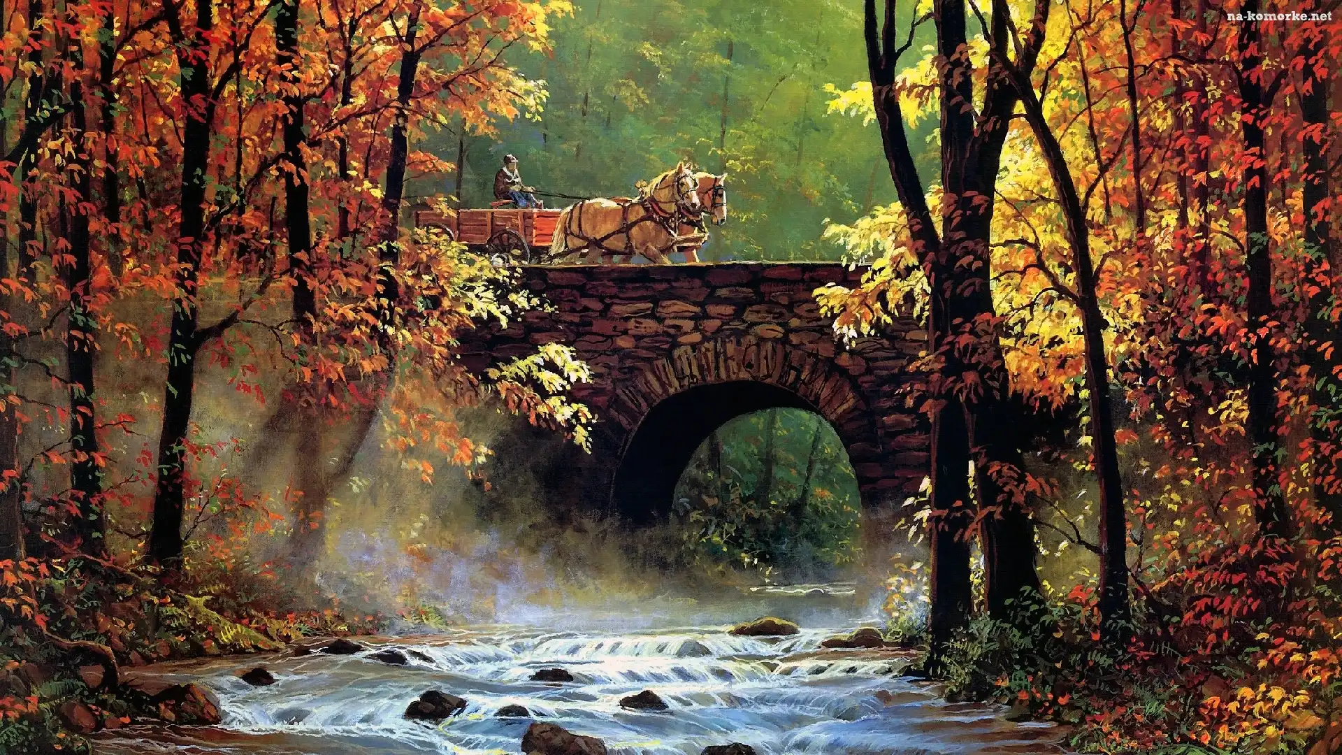 Rzeka, Drzewa, Las, Kamienny, Chris Cummings, Furmanka, Jesień, Most, Malarstwo, Konie, Mgła na Komórkę |