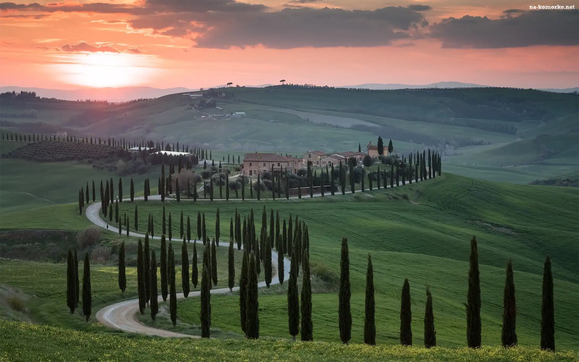 Toskania, Cyprysy, Chmury, Włochy, Domy, Droga, Drzewa na Komórkę