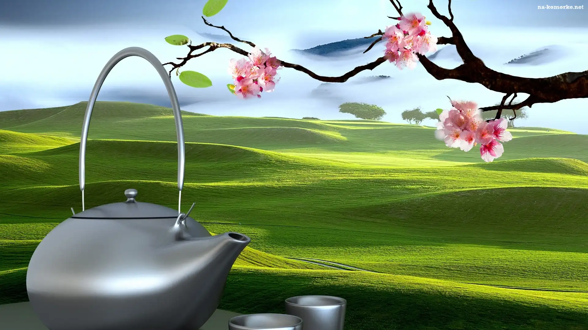 Grafika, Czajnik, Łąki, Imbryk, Pola, Drzewo, Owocowe, Gałązka na Komórkę