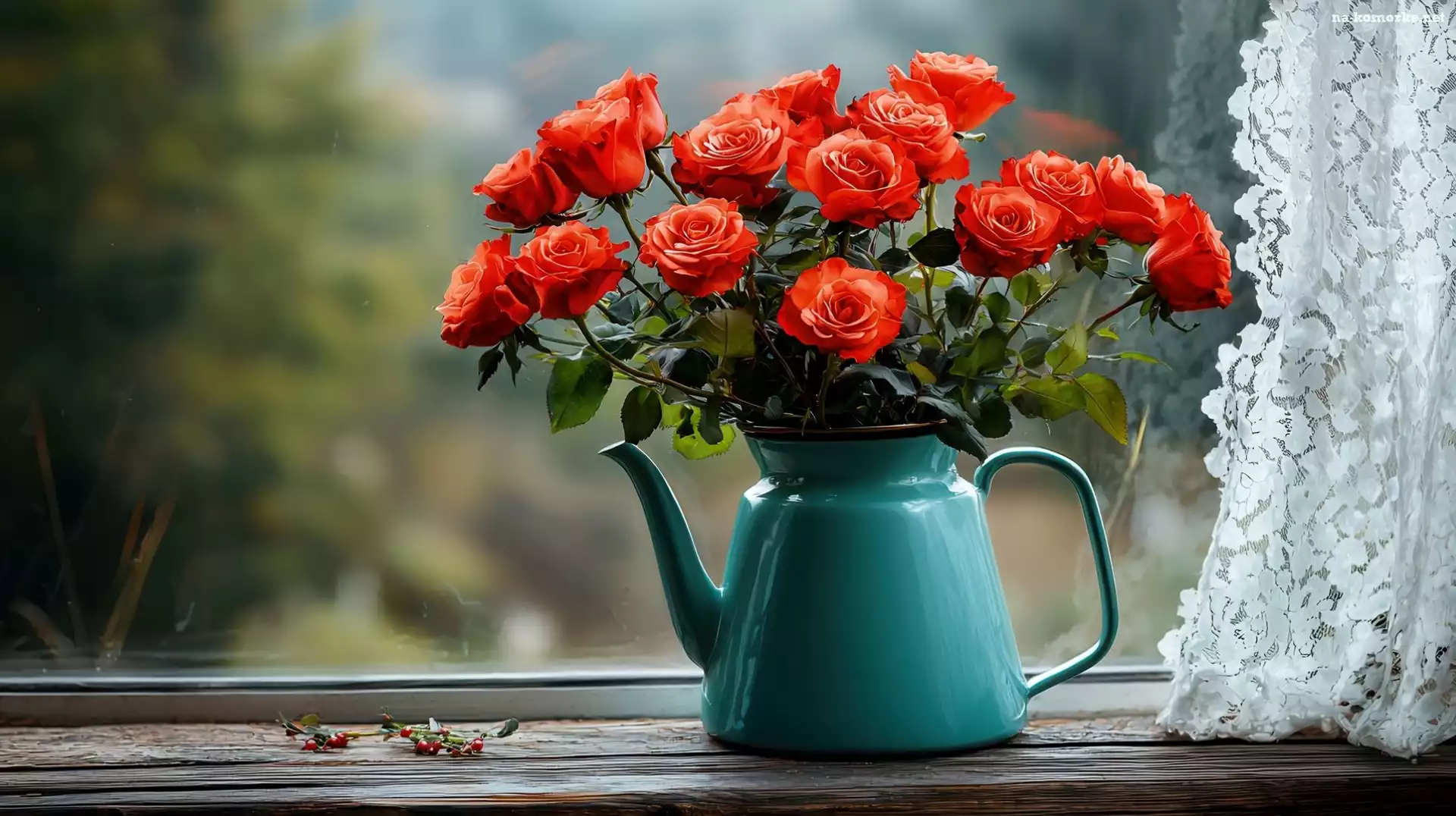 Kwiaty, Czajnik, Parapet, Róże, Okno na Komórkę