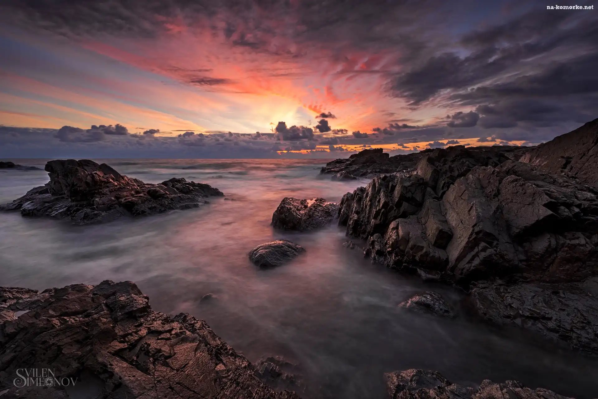 Morze Czarne, Gmina Carewo, Bułgaria, Skały, Chmury, Zachód słońca, Rezowo na Komórkę