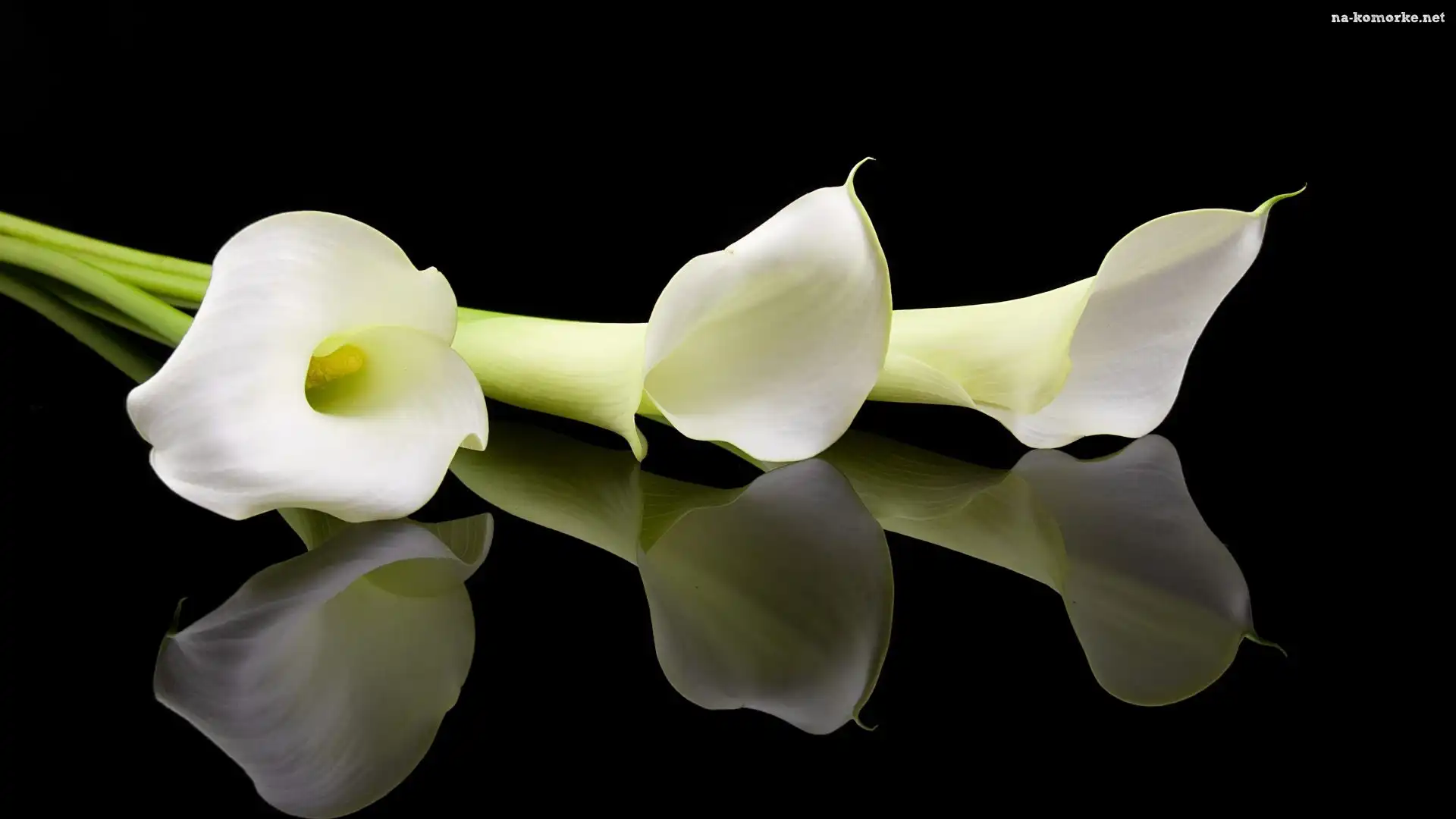 Czarne tło, Kwiaty, Białe, Kalie, Odbicie na Komórkę