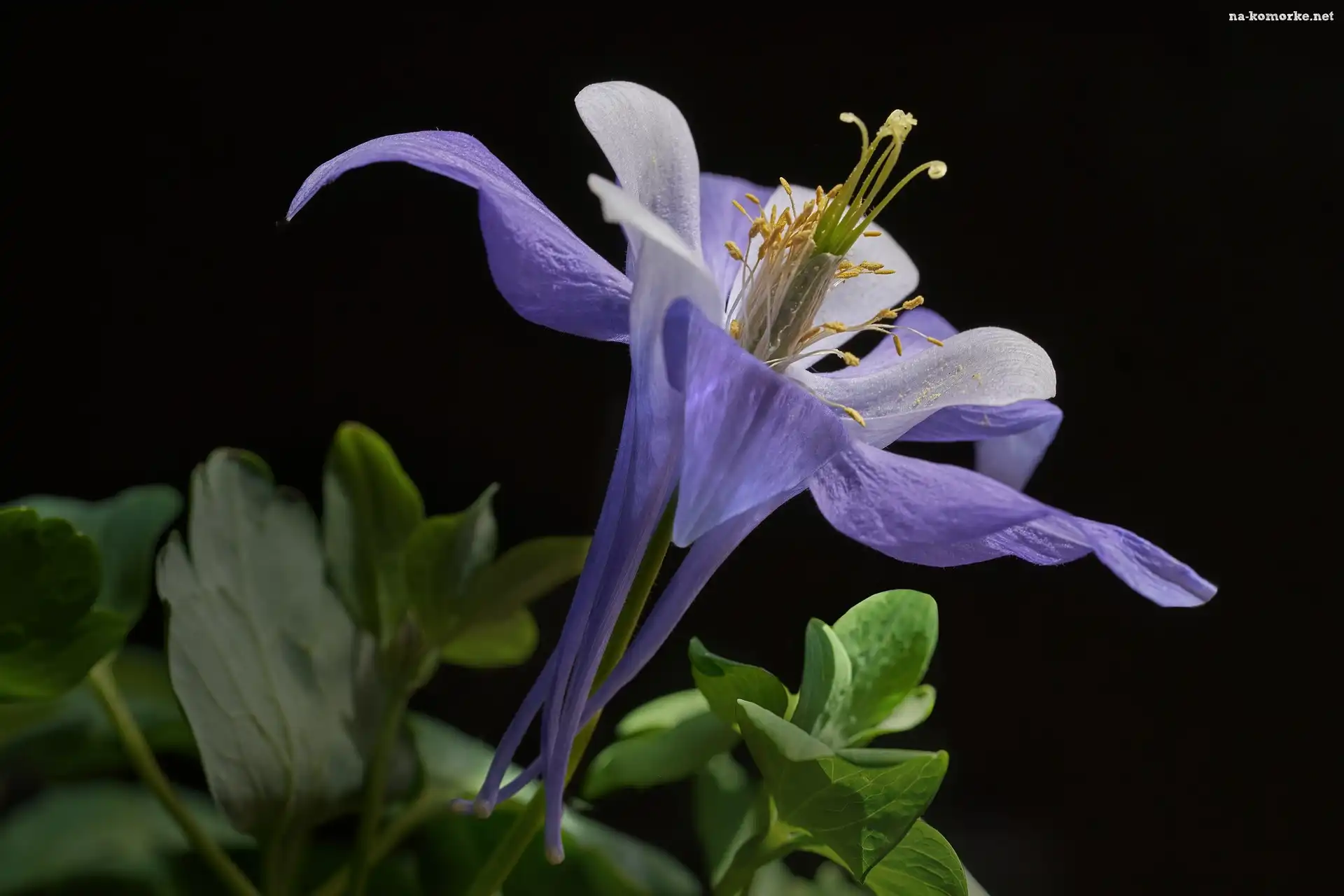 Czarne tło, Fioletowy, Kwiat, Orlik, Liście na Komórkę