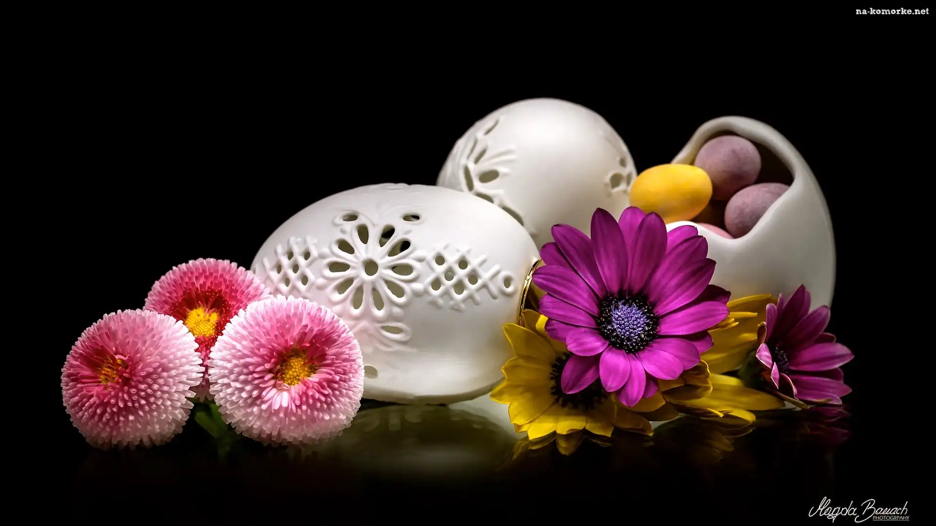 Kompozycja, Czarne, Ażurowe, Tło, Wielkanoc, Pisanki, Kwiaty, Stokrotki na Komórkę