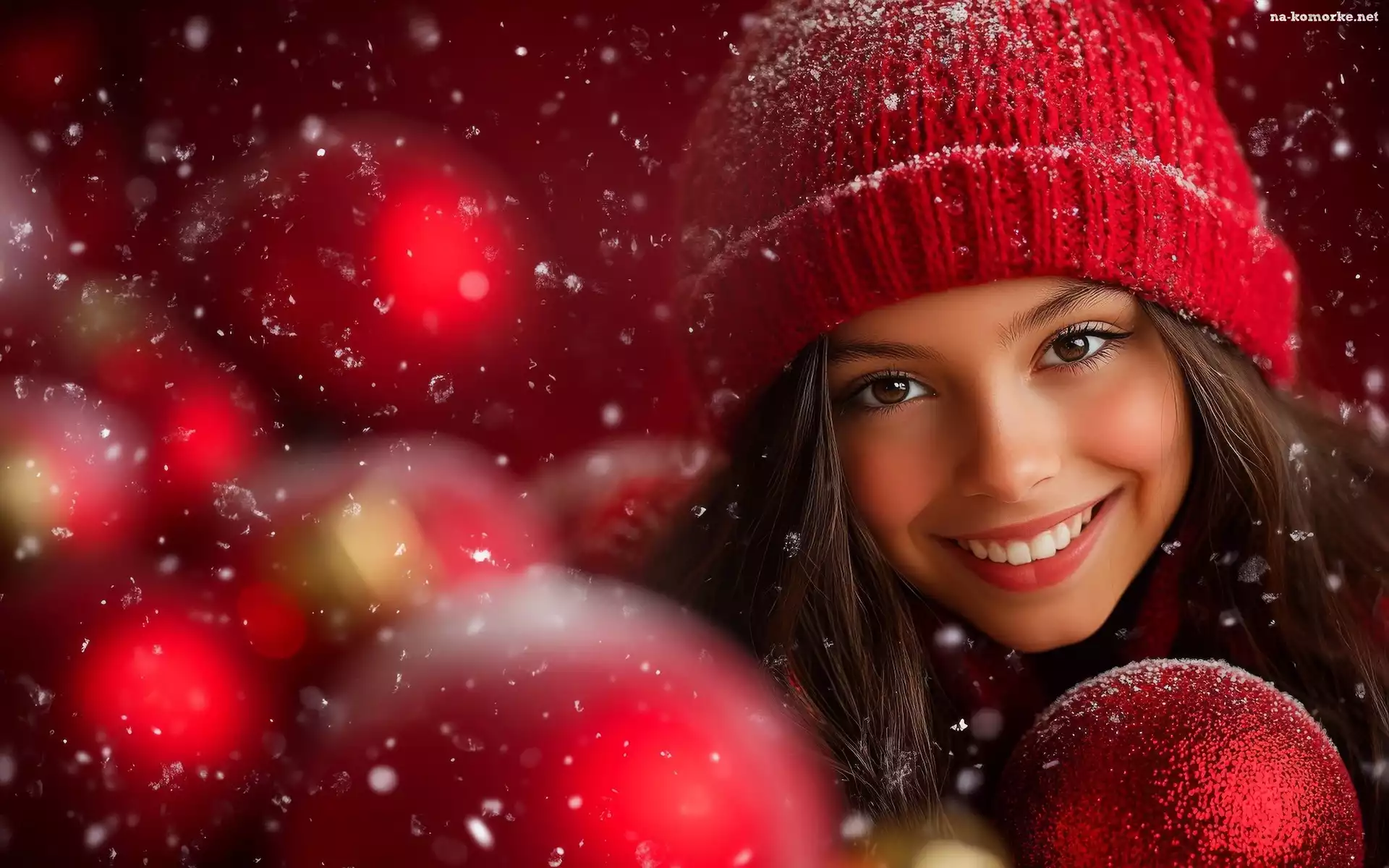 Kobieta, Czerwona, Bombki, Czapka, Śnieg na Komórkę