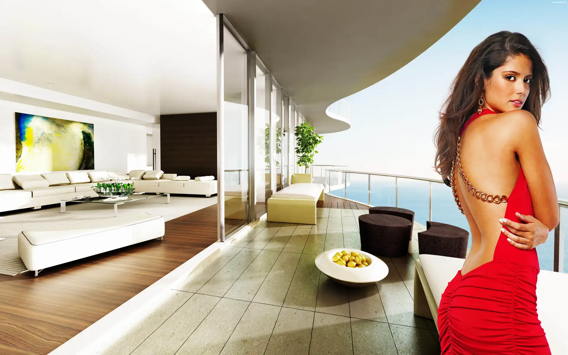 Dom, Czerwona, Suknia, Salon, Balkon, Ładna, Kobieta na Komórkę