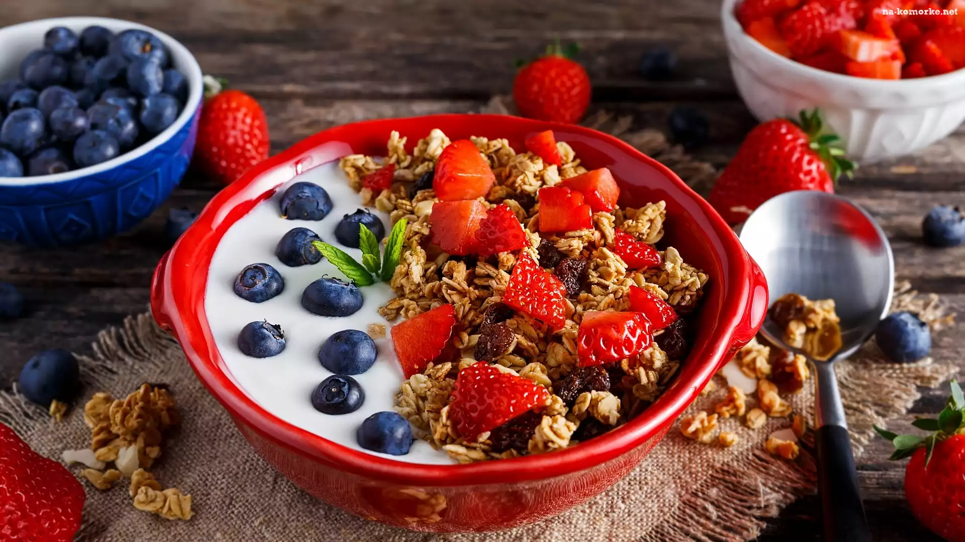 Płatki, Czerwona, Miseczka, Jogurt, Owoce, Borówki, Truskawki na Komórkę