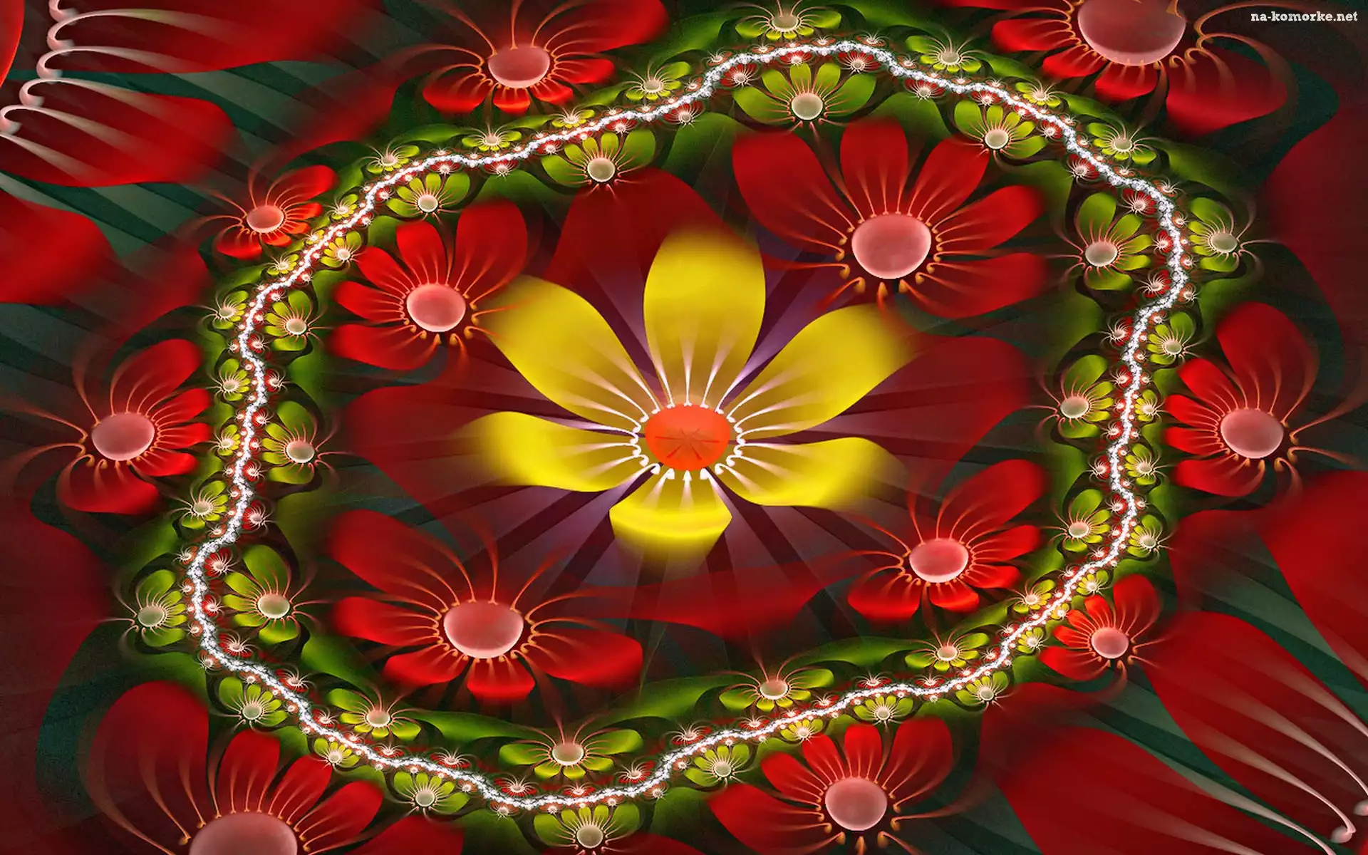 Abstrakcja, Grafika, Komputerowa Rzędy, Kolorowych, Kwiatów Wazon, Przybranie, Tulipany Żurawka Kolorowe, Światełka Kolorowe, Flary Multikolorowa, Ścieżka Niebieskie, Wstęgi Granatowe, Figury, Naczynia Herbaciana, Rozwinięta, Róża Kolorowe, Serduszka Wrzos, Kamienie Ognisty, Smok Żółte, Niebieskie, Irysy