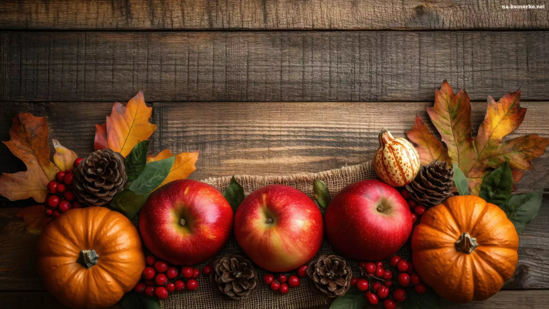 Czerwone, Grafika AI, Szyszki, Liście, Deski, Kompozycja, Jabłka, Dynie na Komórkę