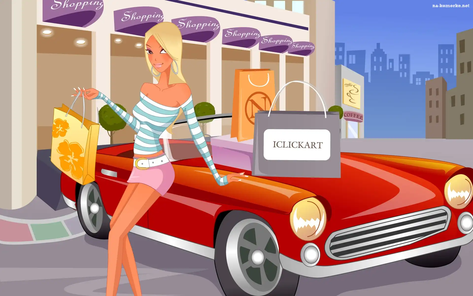 Czerwony, Domy, Grafika, Zakupy, Blondynka, Samochód na Komórkę
