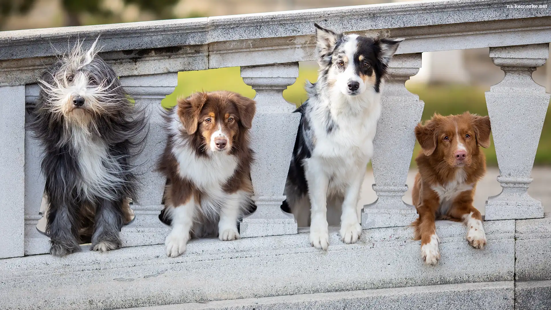 Cztery, Kamienna, Owczarek staroangielski Bobtail, Balustrada, Psy, Owczarek australijski, Border collie, Retriever z Nowej Szkocji na Komórkę |