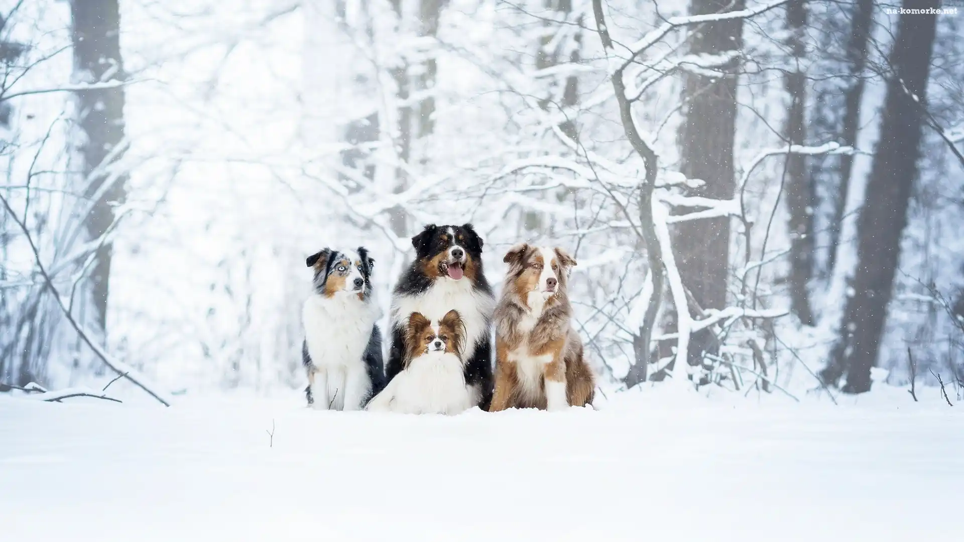 Cztery, Zima, Drzewa, Psy, Owczarek australijski, Berneński pies pasterski, Spaniel kontynentalny miniaturowy Papillon na Komórkę |