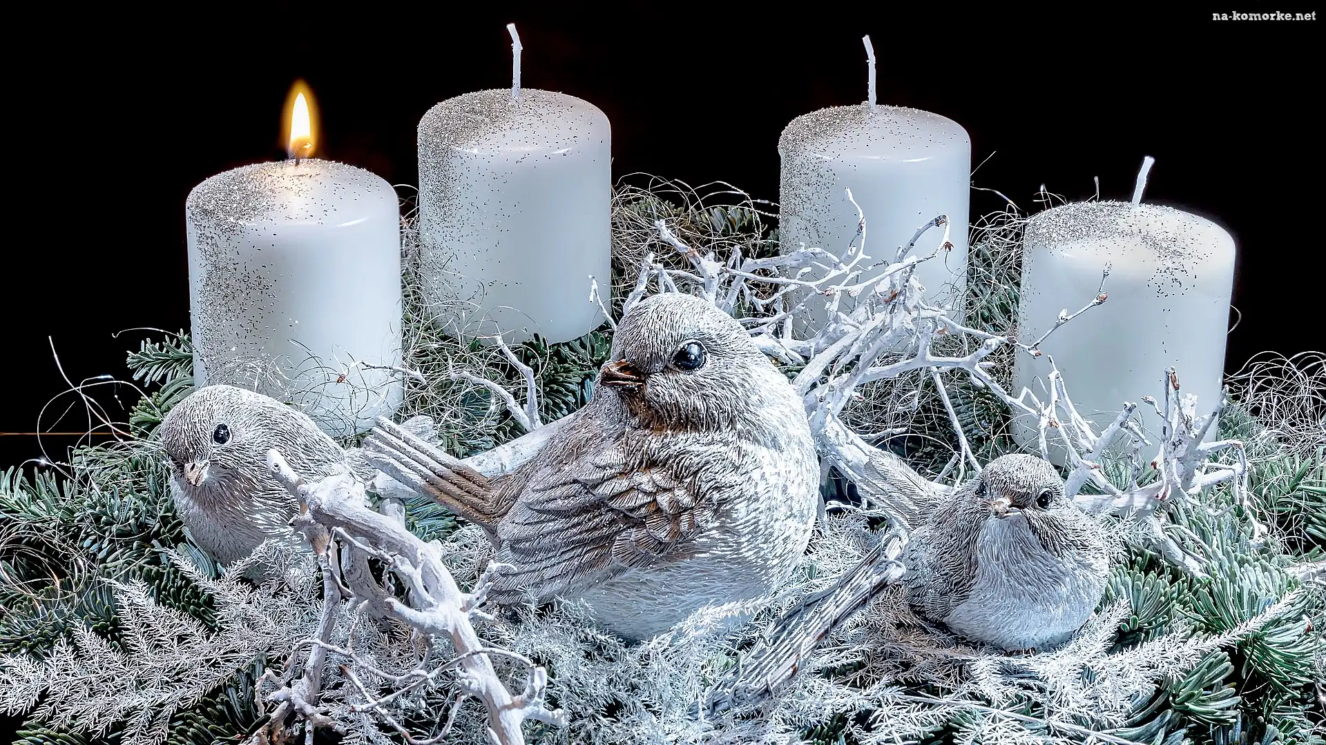 Świece, Cztery, Jodła, Stroik, Czarne tło, Białe, Adwent, Gałązki, Ptaszki na Komórkę