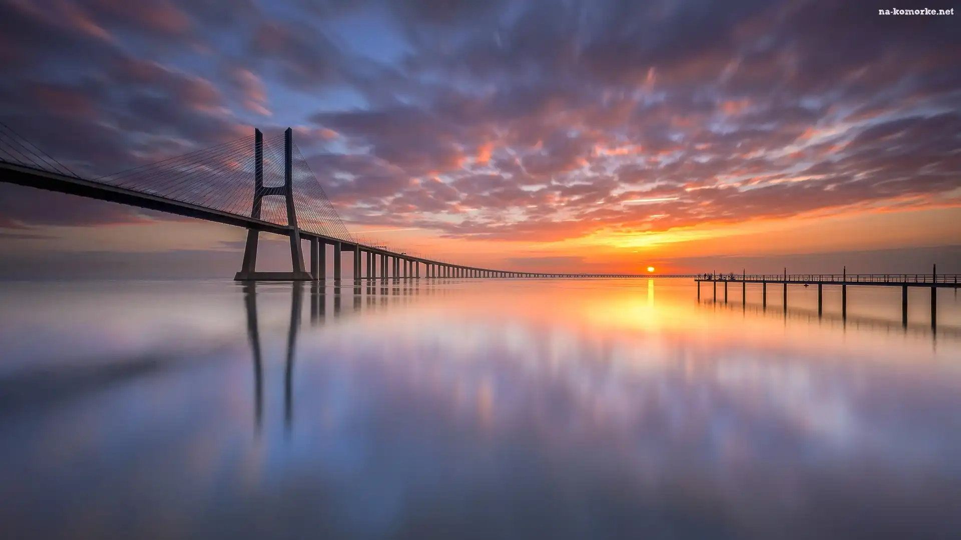 Most Vasco da Gama, Wschód słońca, Rzeka Tag, Portugalia, Chmury, Lizbona na Komórkę