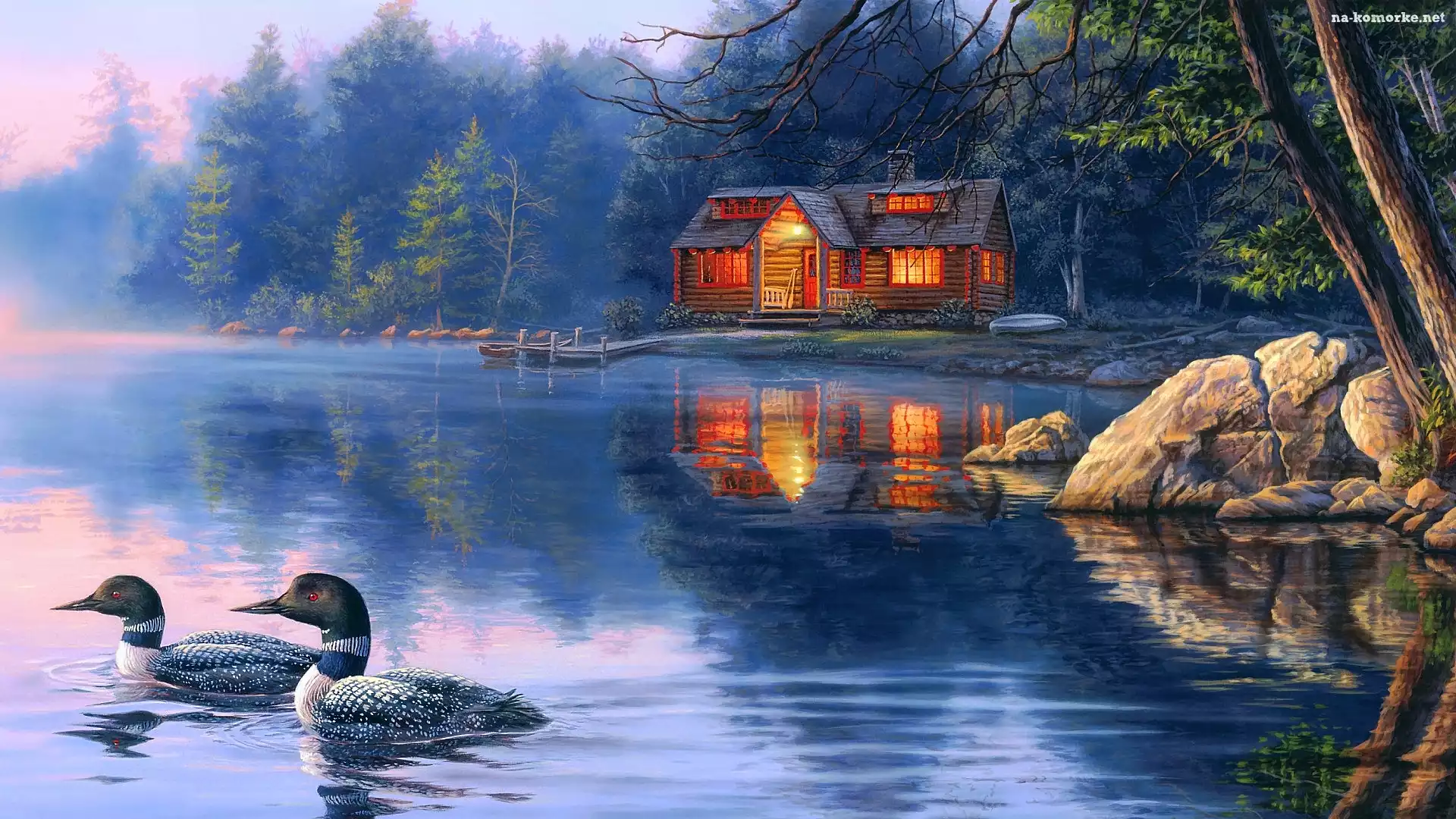 Oświetlony, Pomost, Darrell Bush, Dom, Malarstwo, Mgła, Drewniany, Las, Jezioro, Kaczki na Komórkę