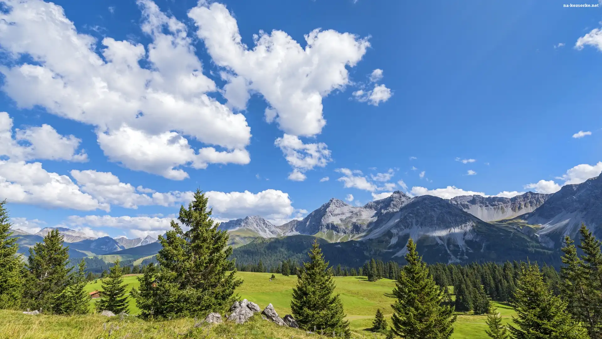 Drzewa, Davos, Szwajcaria, Chmury, Góry Albula-Alpen, Łąki na Komórkę