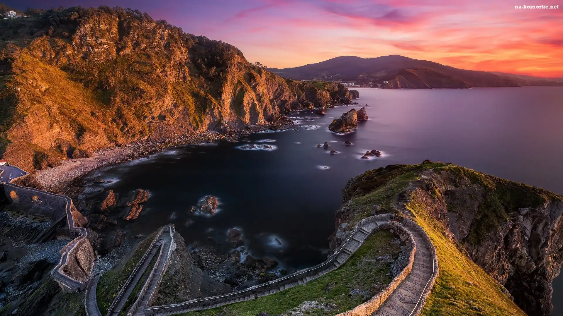 Góry, Wyspa San Juan de Gaztelugatxe, Zatoka Biskajska, Hiszpania, Morze, Wybrzeże, Skały, Zachód słońca na Komórkę |