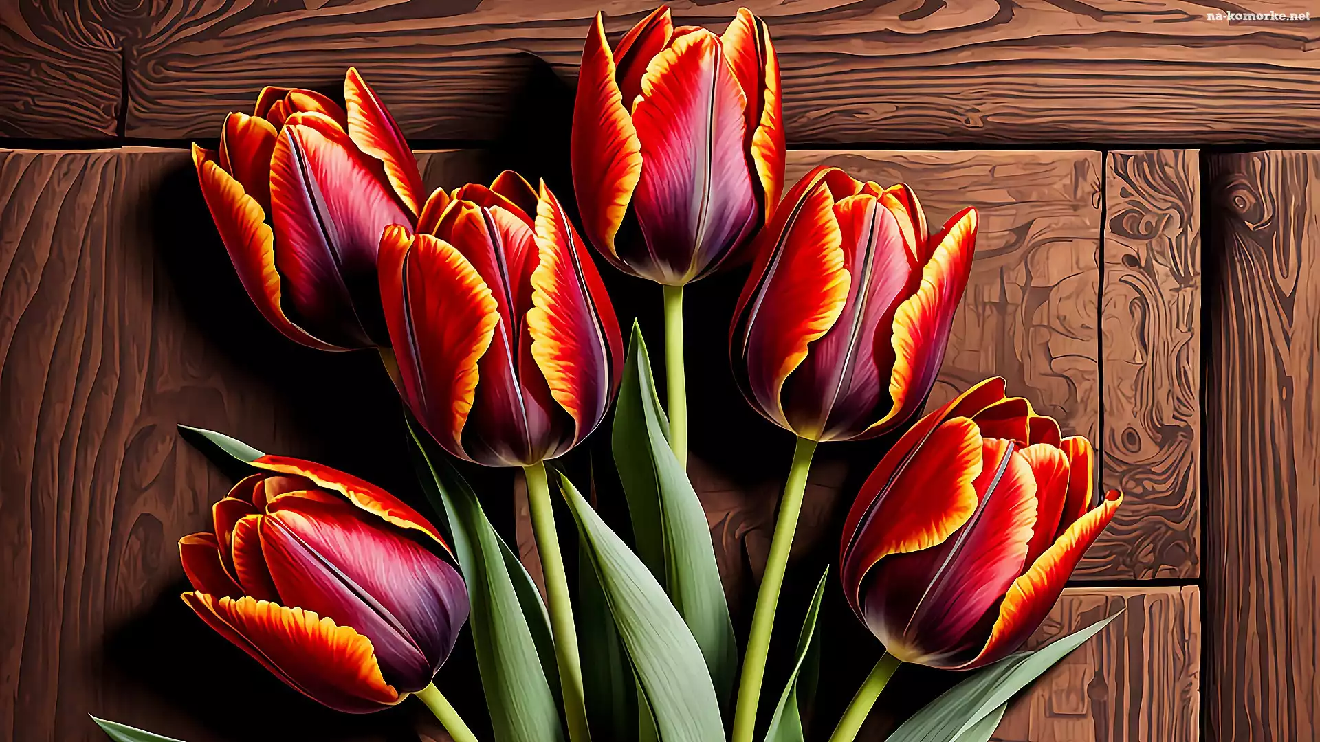 Czerwono-żółte, Listki, Deski, Tulipany, 2D na Komórkę