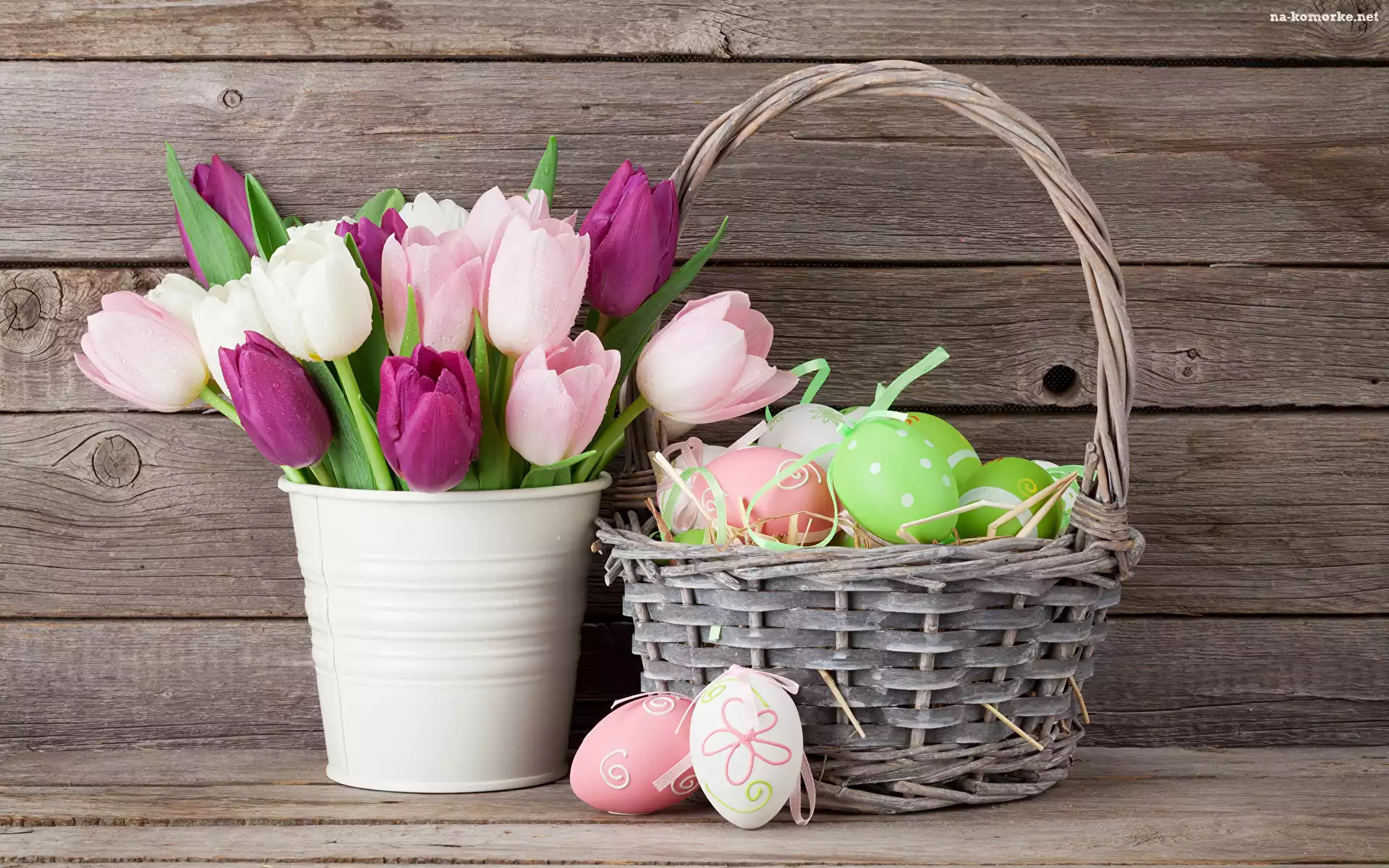 Koszyk, Pisanki, Białe, Deski, Kolorowe, Tulipany, Wiaderko na Komórkę