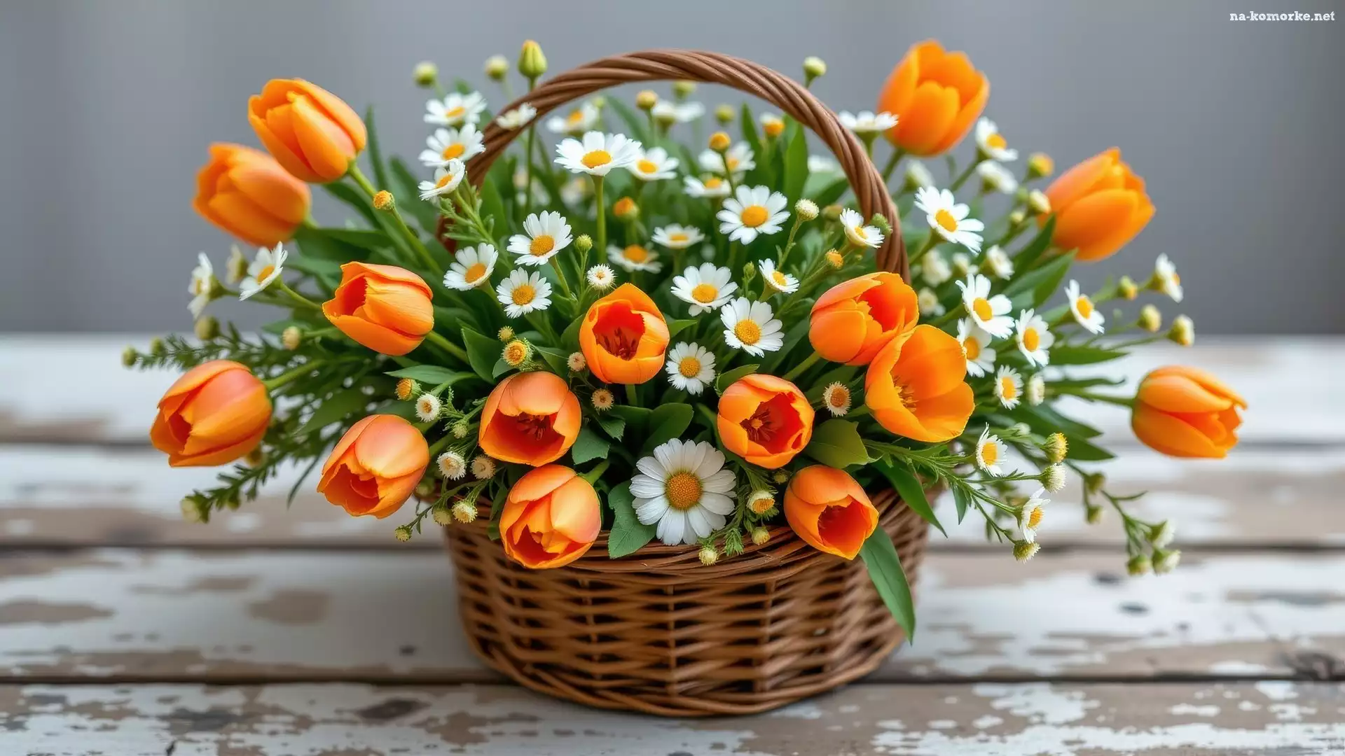 Wiklinowy, Kosz, Pomarańczowe, Deski, Białe, Stokrotki, Tulipany na Komórkę