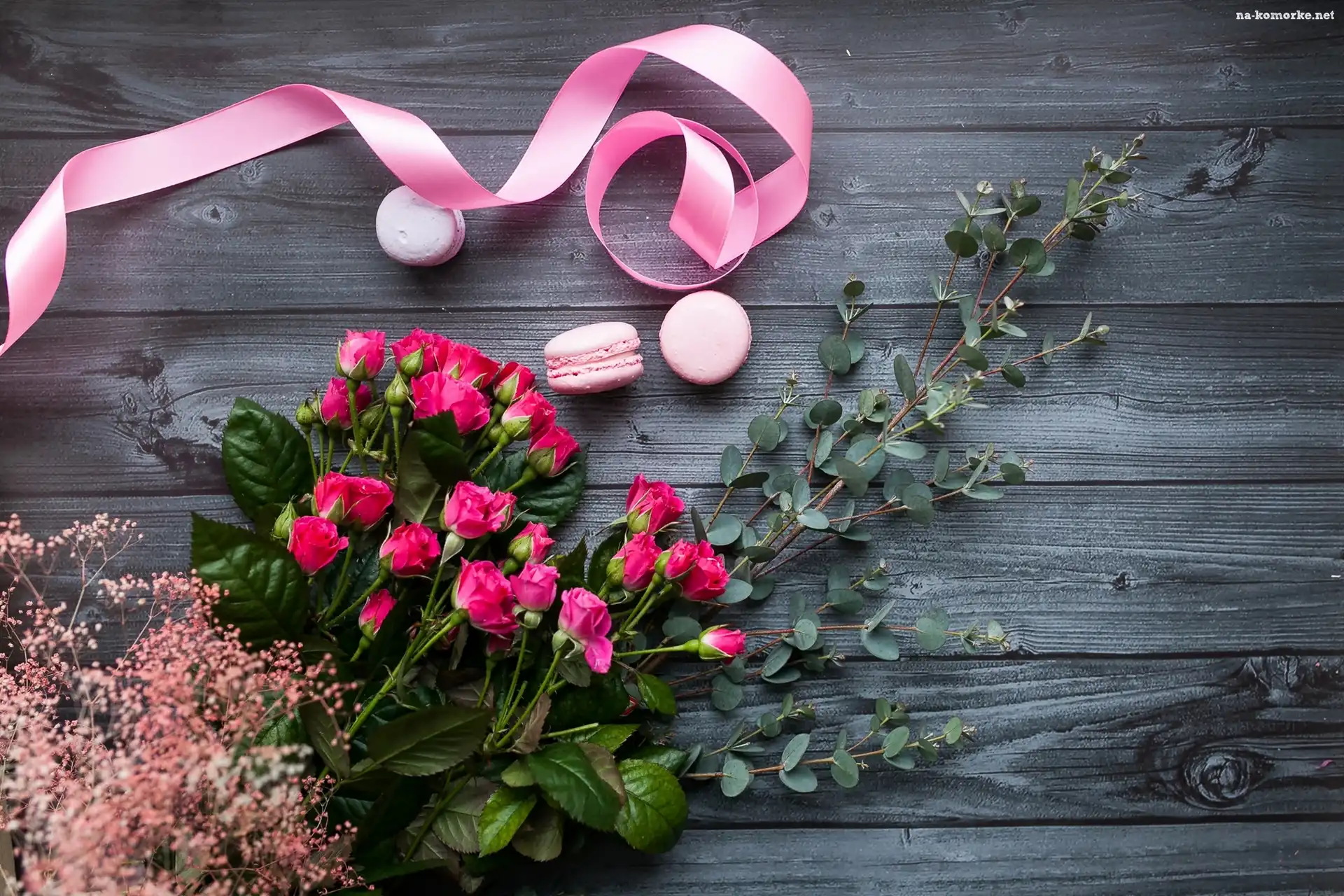 Deski, Bukiet, Róże, Wstążka, Makaroniki na Komórkę