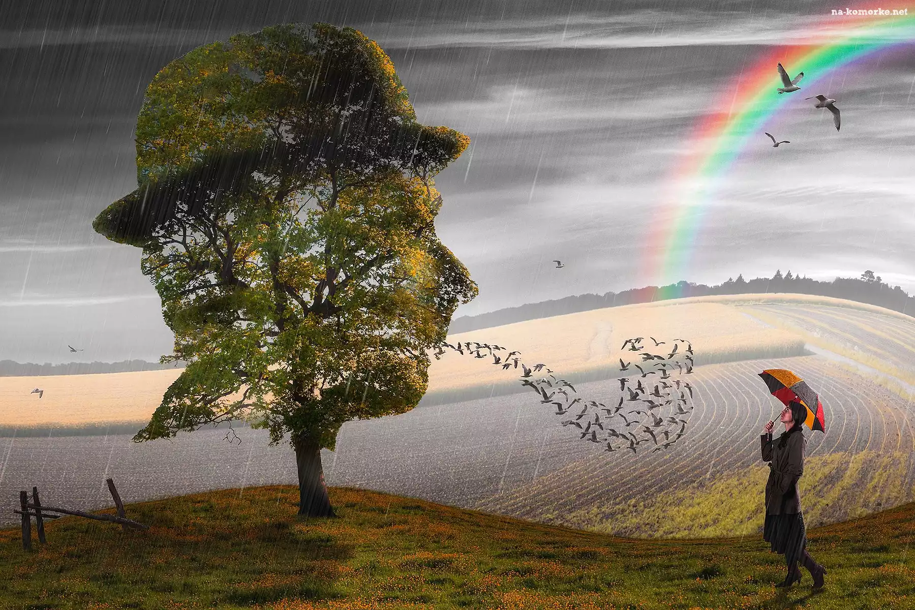 Grafika, Deszcz, Parasolka, Drzewo, Ptaki, Tęcza, Dziewczyna na Komórkę