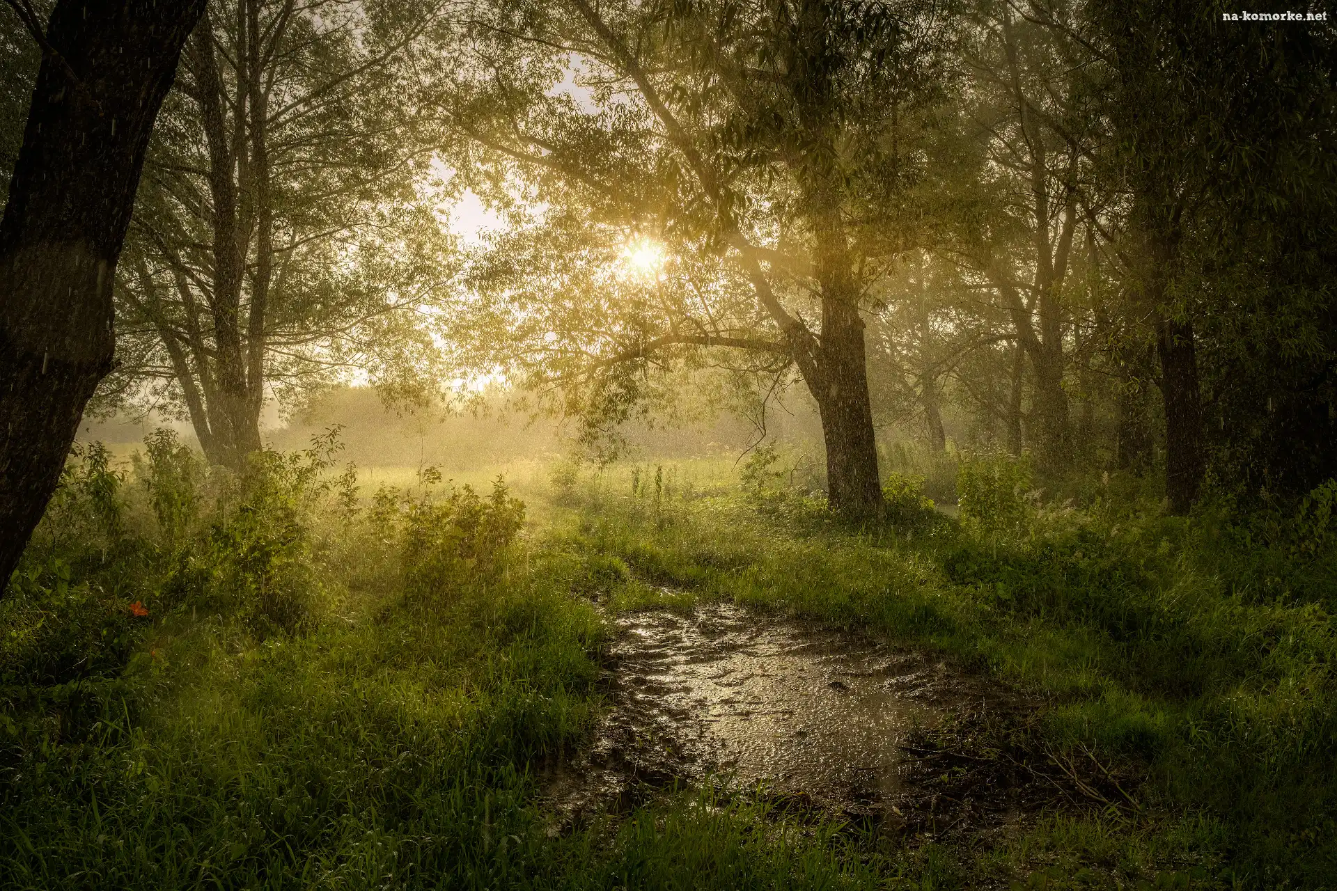 Las, Deszcz, Lato, Trawy, Promienie słońca, Drzewa na Komórkę