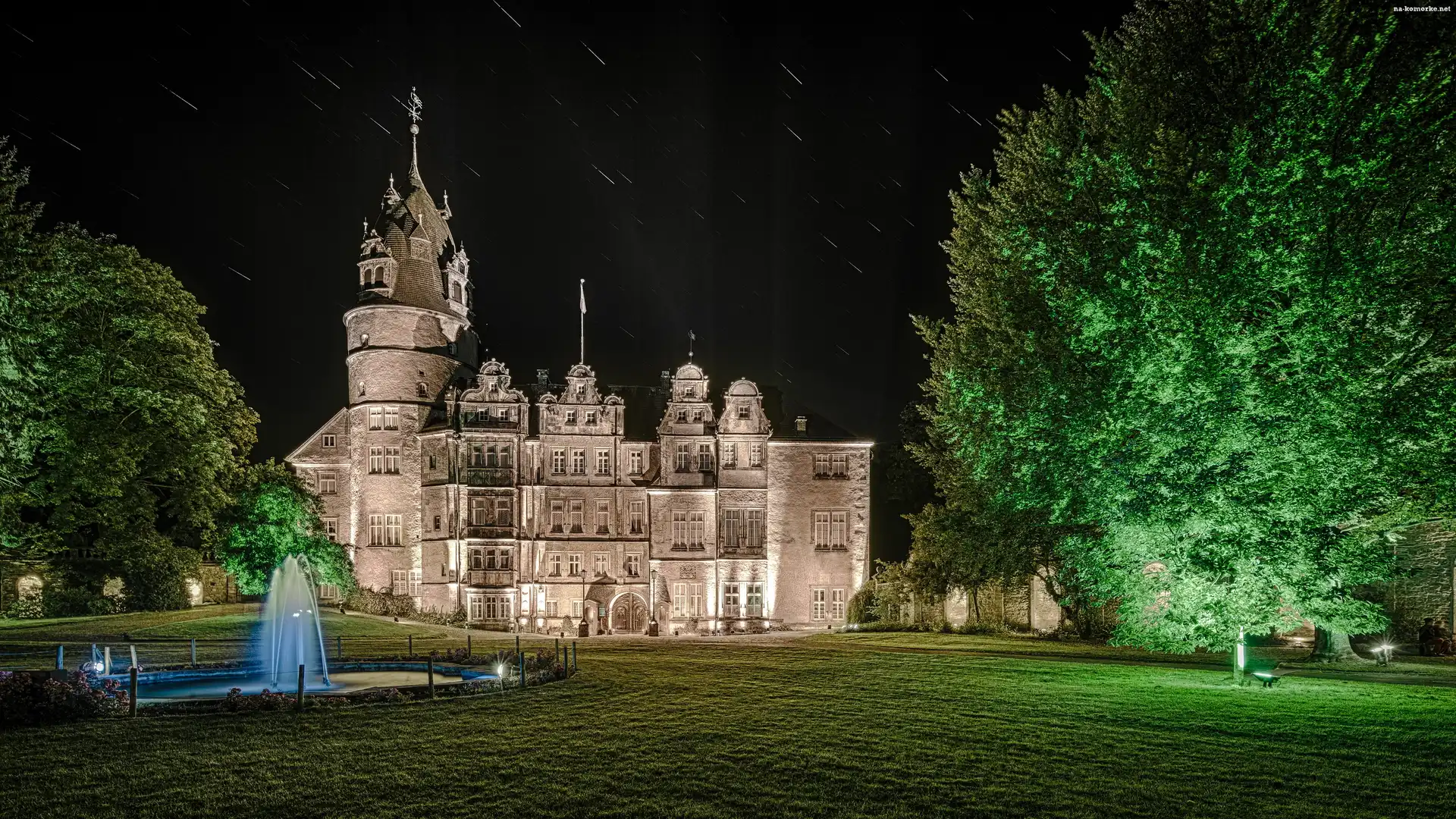 Noc, Detmold, Niemcy, Fontanna, Zamek Residence Detmold, Drzewa na Komórkę