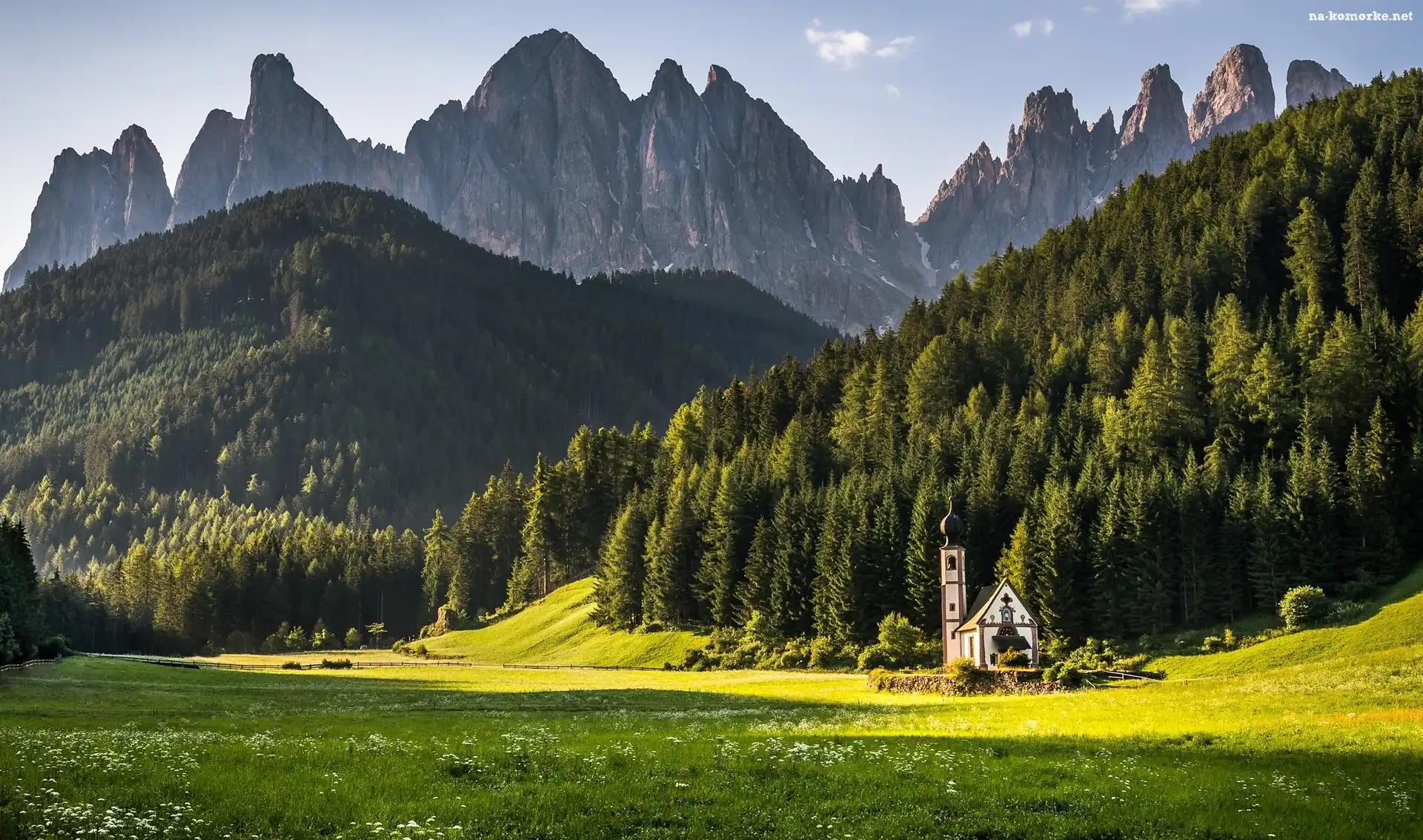 Włochy, Las, Drzewa, Dolina Val di Funes, Kościół św. Jana, Dolomity, Góry na Komórkę