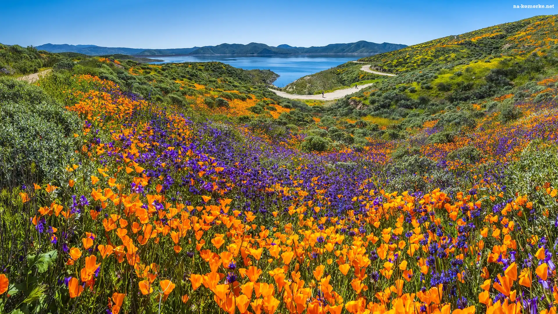 Kwiaty, Dolina, Łąka, Diamond Valley Lake, Jezioro, Kalifornia, Stany Zjednoczone, Diamond Valley, Pozłotki na Komórkę |