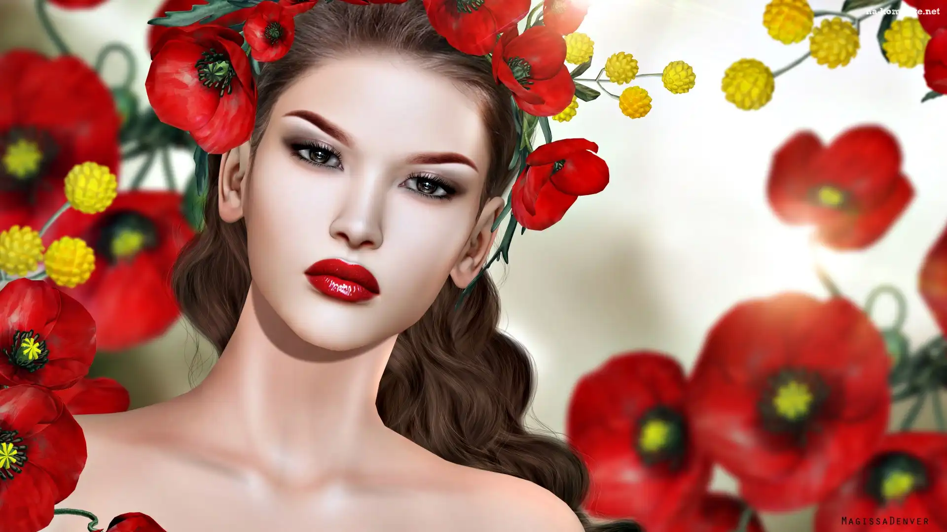 Długie, Kwiaty, Dziewczyna, Grafika, Maki, Włosy na Komórkę