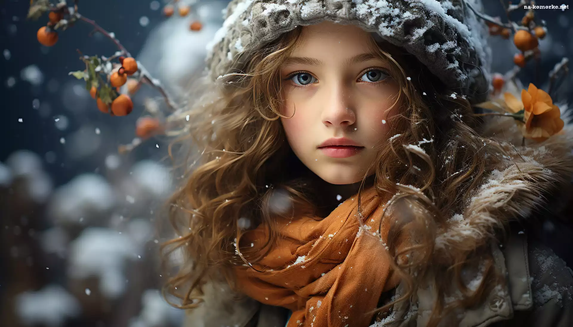 Kręcone, Pomarańczowy, Ośnieżona, Dziewczynka, Czapka, Szalik, Włosy, Długie na Komórkę