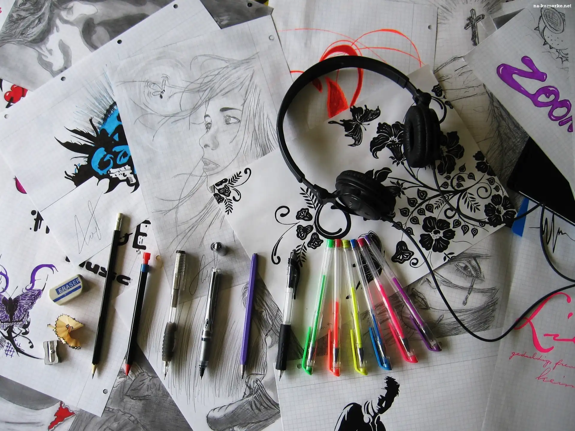 Długopisy, Rysunki, Ołówki, Słuchawki na Komórkę