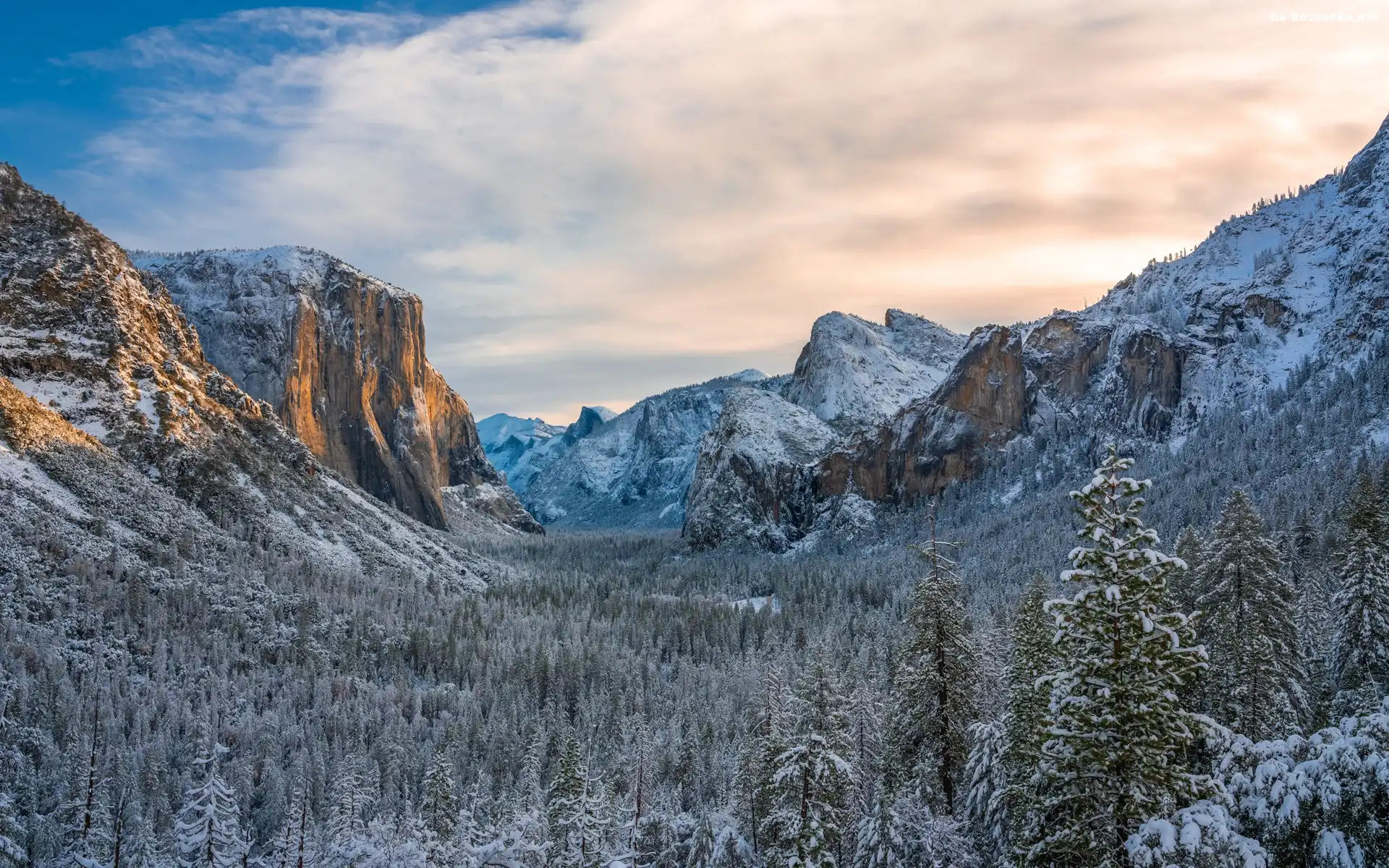 Dolina, Zima, Stany Zjednoczone, Park Narodowy Yosemite, Stan Kalifornia, Lasy, Yosemite Valley, Ośnieżone, Góry, Drzewa na Komórkę |