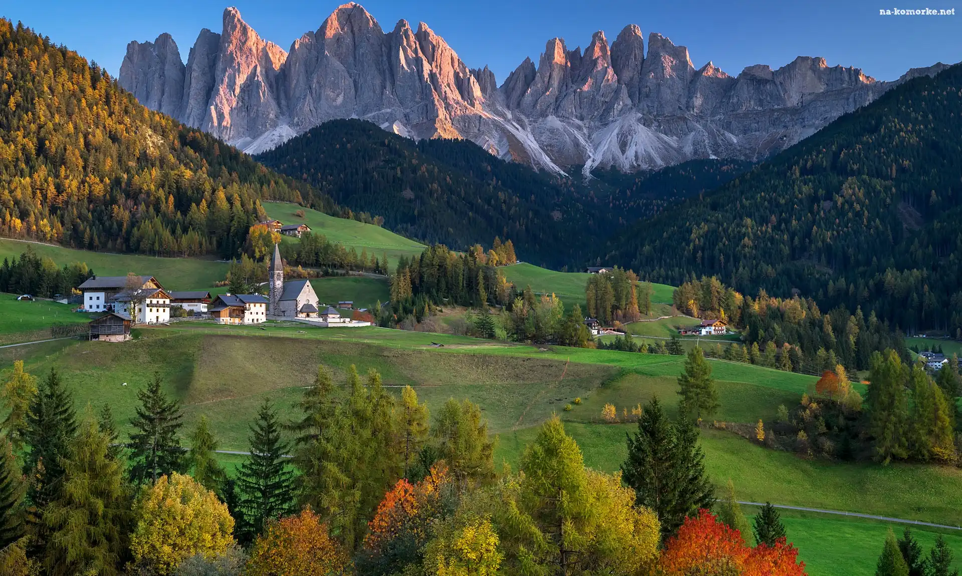 Góry, Val di Funes, Wieś, Santa Maddalena, Lasy, Dolina, Włochy, Rozświetlone, Drzewa, Kościół, Dolomity na Komórkę |