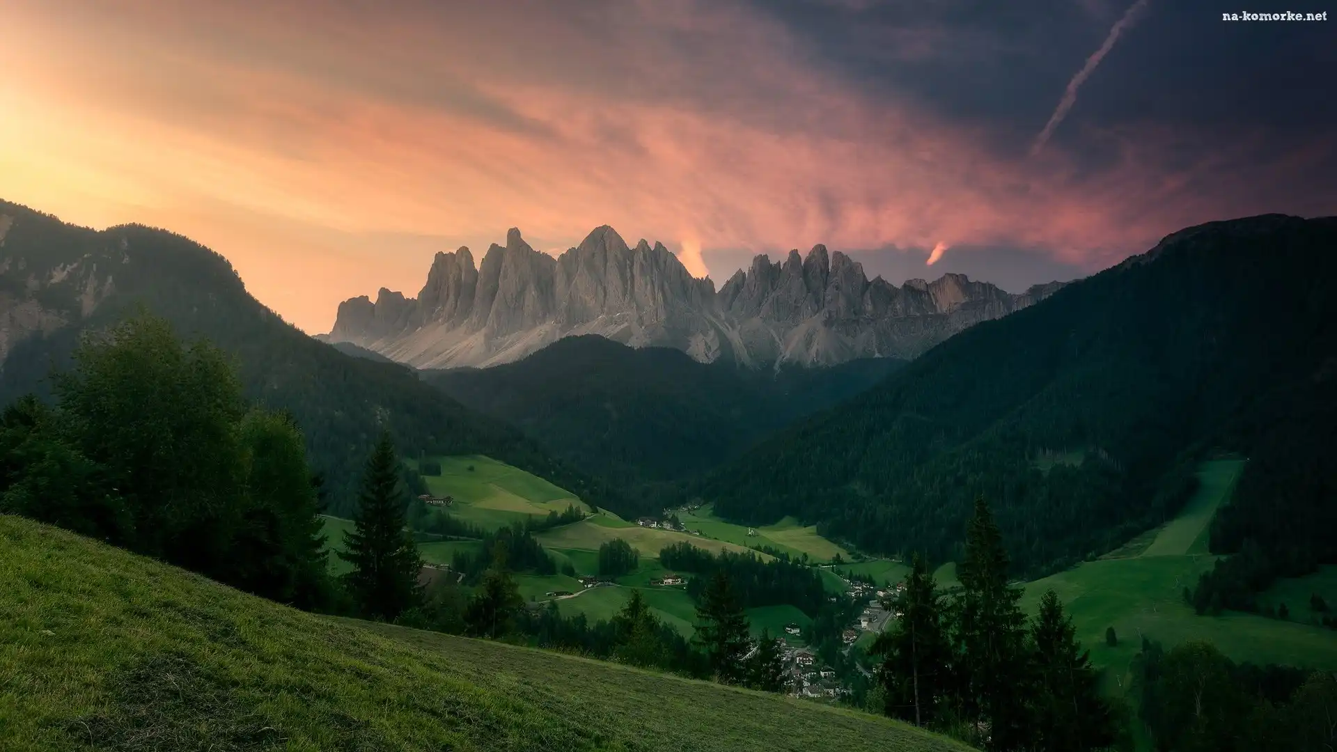 Lasy, Góry, Dolina, Drzewa, Włochy, Dolomity, Wschód słońca, Domy, Val di Funes na Komórkę