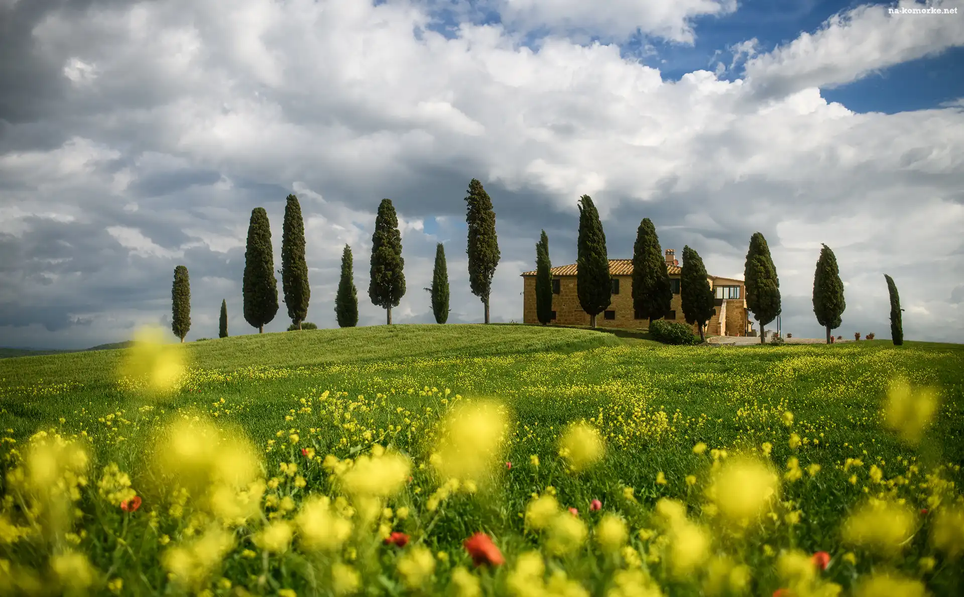 Dom, Drzewa, Łąka, Włochy, Cyprysy, Toskania na Komórkę