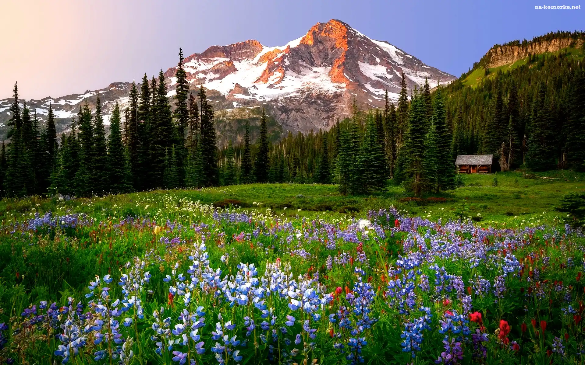 Góra, Dom, Drewniany, Łąka, Kwiaty, Polne, Drzewa na Komórkę