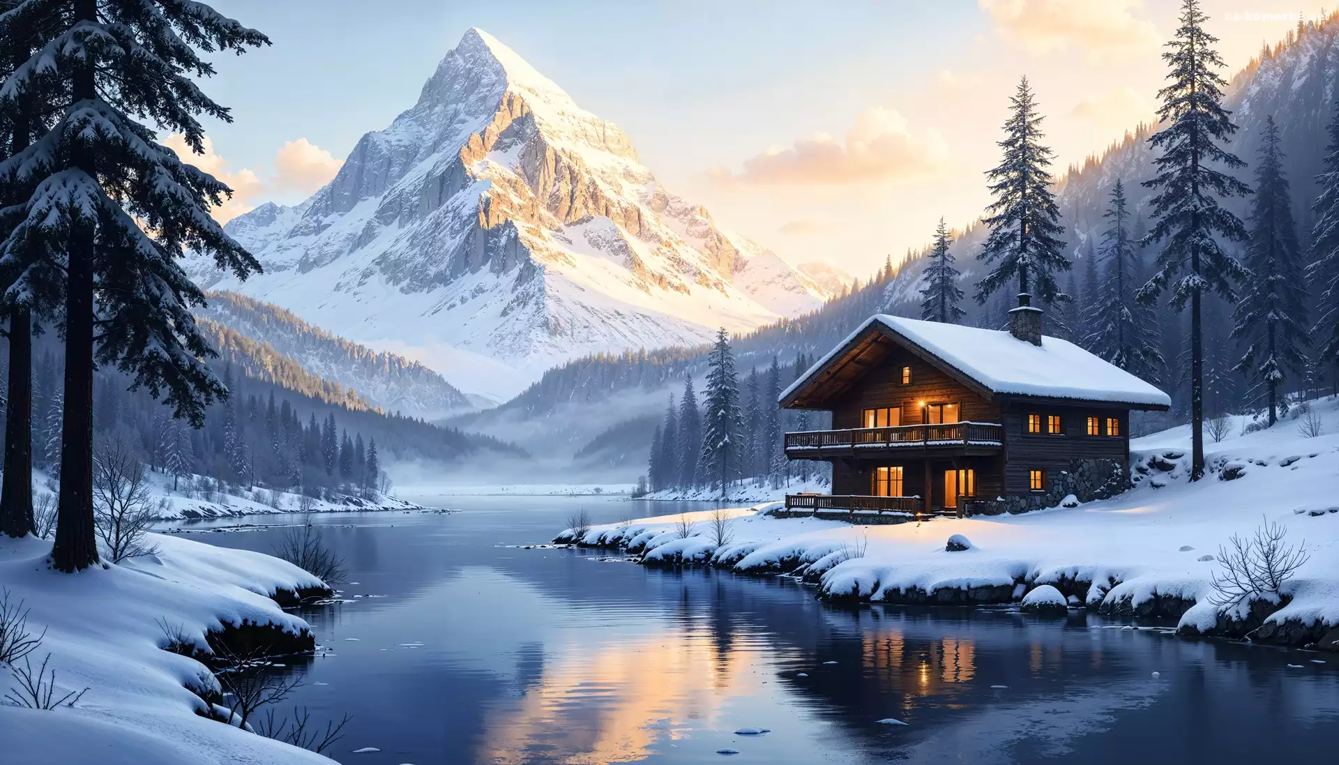 Zima, Dom, Góry, Rzeka, Grafika na Komórkę