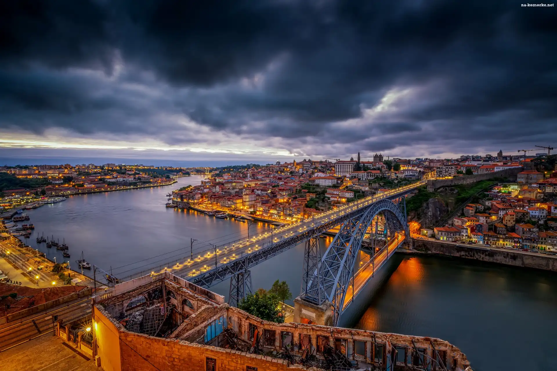 Most Ponte Dom Luis I, Porto, Portugalia, Chmury, Rzeka Duero, Ciemne na Komórkę