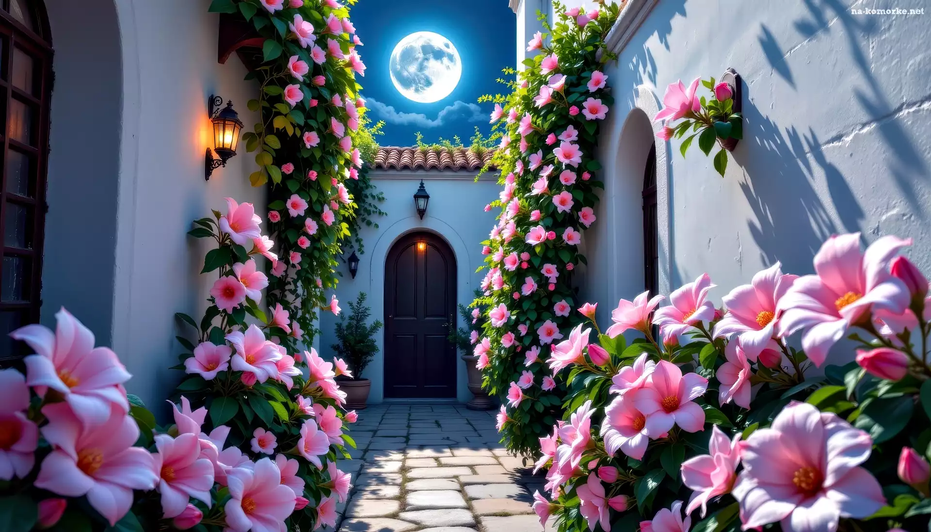 Grafika, Różowe, Noc, Dom, Dziedziniec, Kwiaty na Komórkę