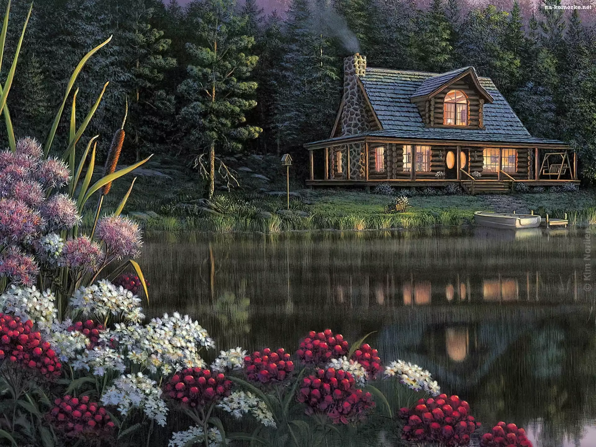 Dom, Kwiaty, Nad, Jeziorem na Komórkę