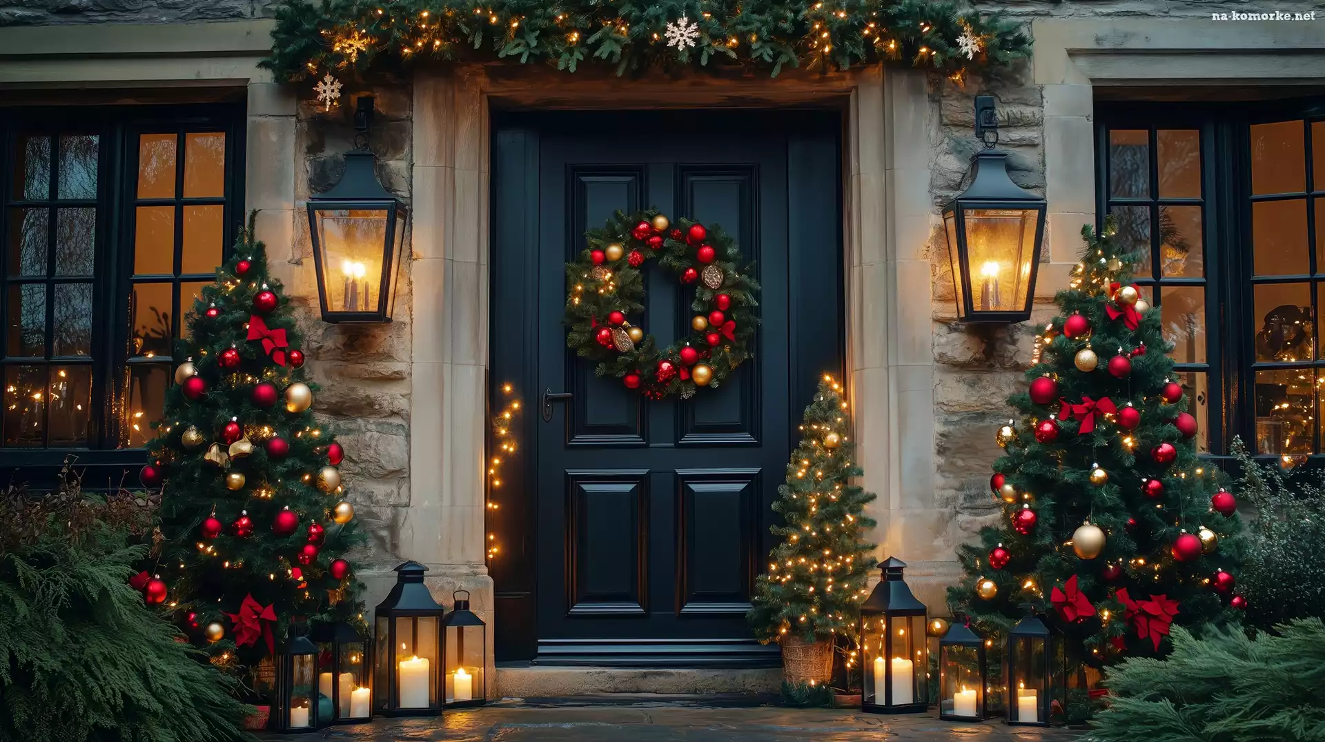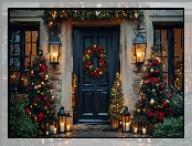 Lampiony, Boże Narodzenie, Choinki, Grafika AI, Wejście, Dom na Komórkę